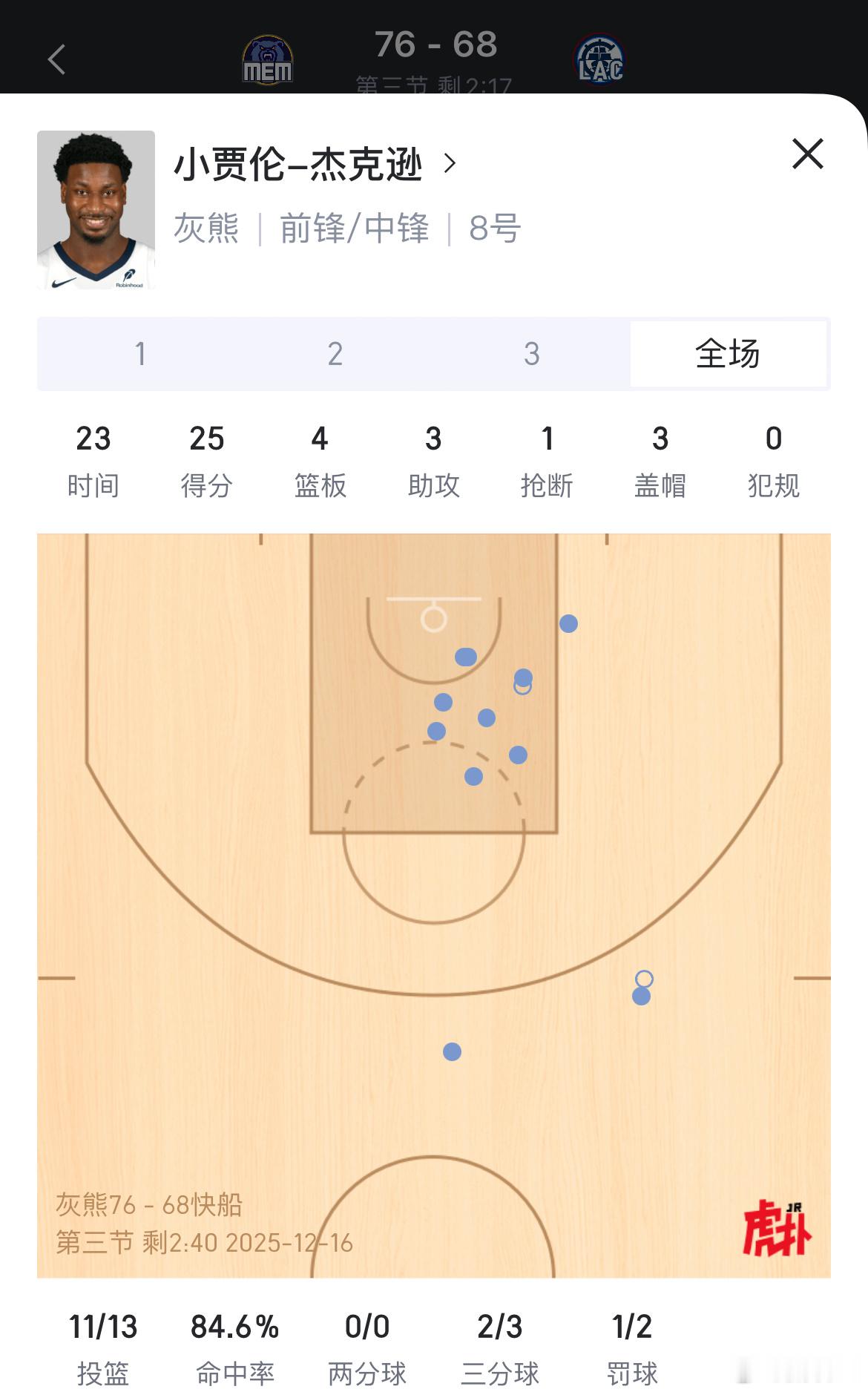 把哈登当瞄准镜了,第三节一半杰克逊已经13投11中25分灰熊vs快船
