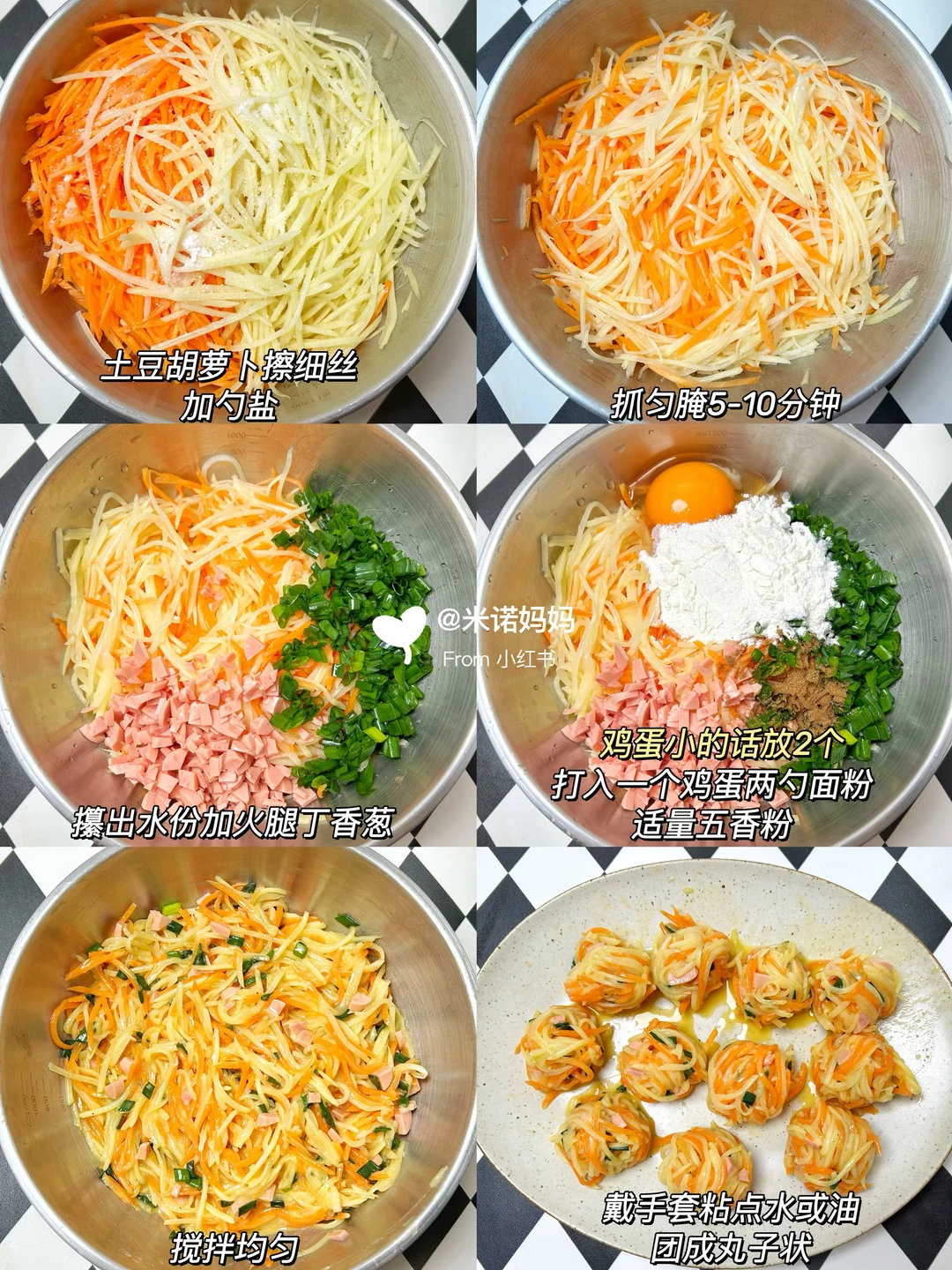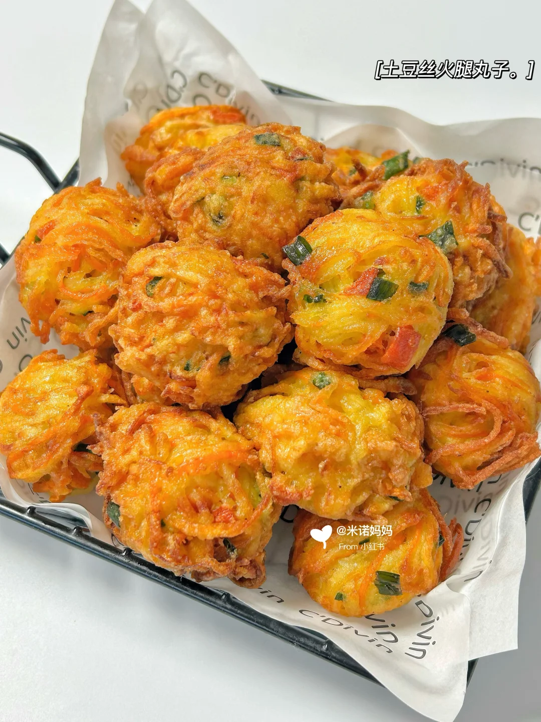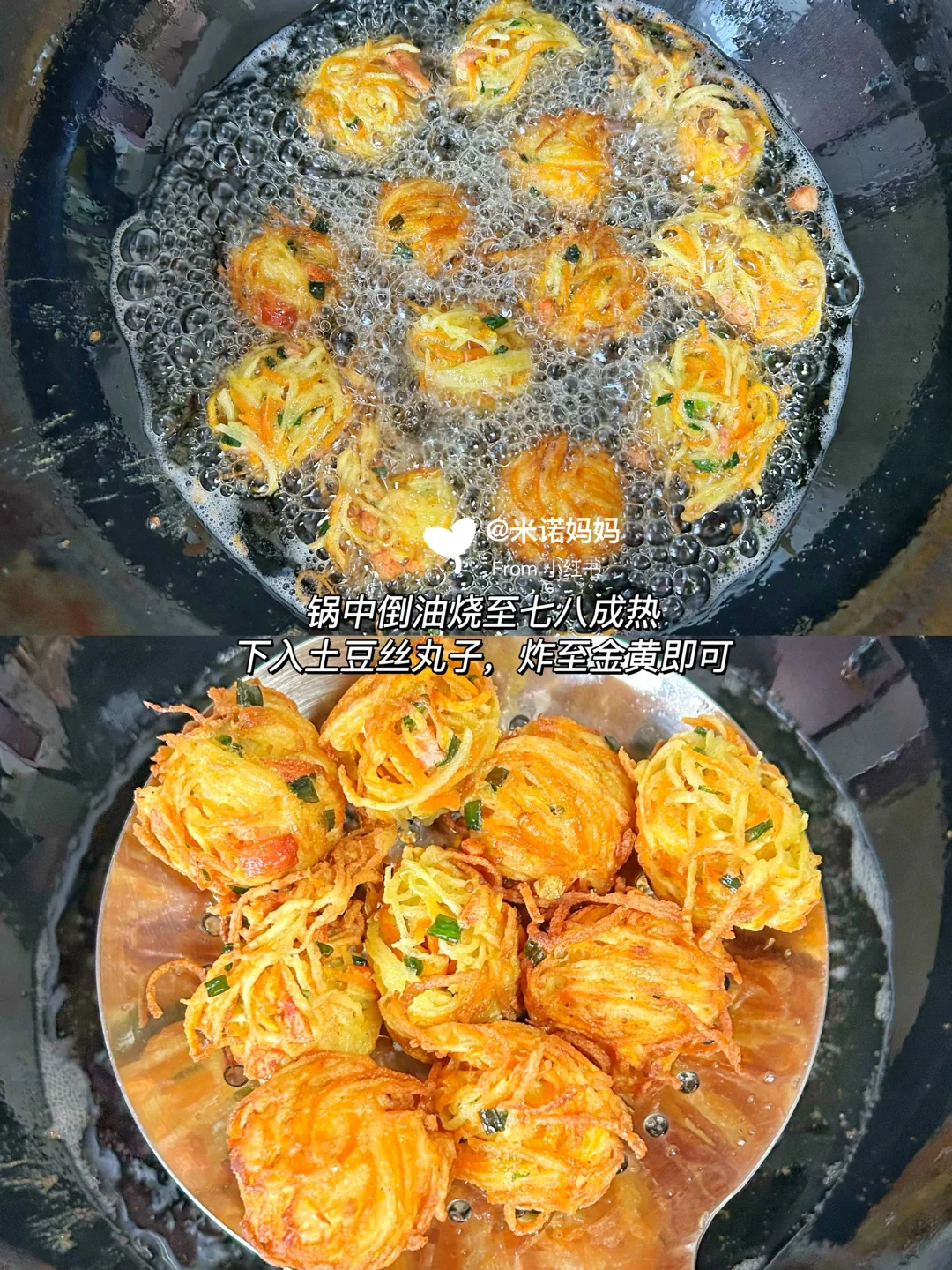 Hi 大家好呀❤️ 今天这个土豆丝火腿丸子被小朋友夸爆啦!外酥里软,小朋友一口一个,好吃到停不下来~做法超简单哦,一学就会,土豆丝加胡萝卜这个搭配真的巨好吃,快去做[派对R] - 🌈准备食材 土豆 | 胡萝卜 | 🥚蛋 | 面粉 | 香葱 👩🏻🍳具体教程请看图文哦~ ✔️火腿丁可不加~ ✔️油温七八成热下入土豆丝丸子,转中小火,炸至全部浮起金黄即可~ ✔️小朋友吃可蘸番茄酱,大人吃可撒点椒盐~ - 巨好吃的土豆丝丸子,快给小朋友安排上吧,小朋友会敲喜欢哒[拥抱R]