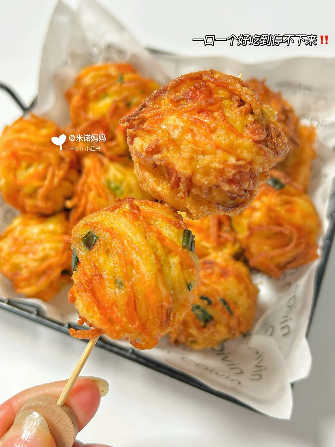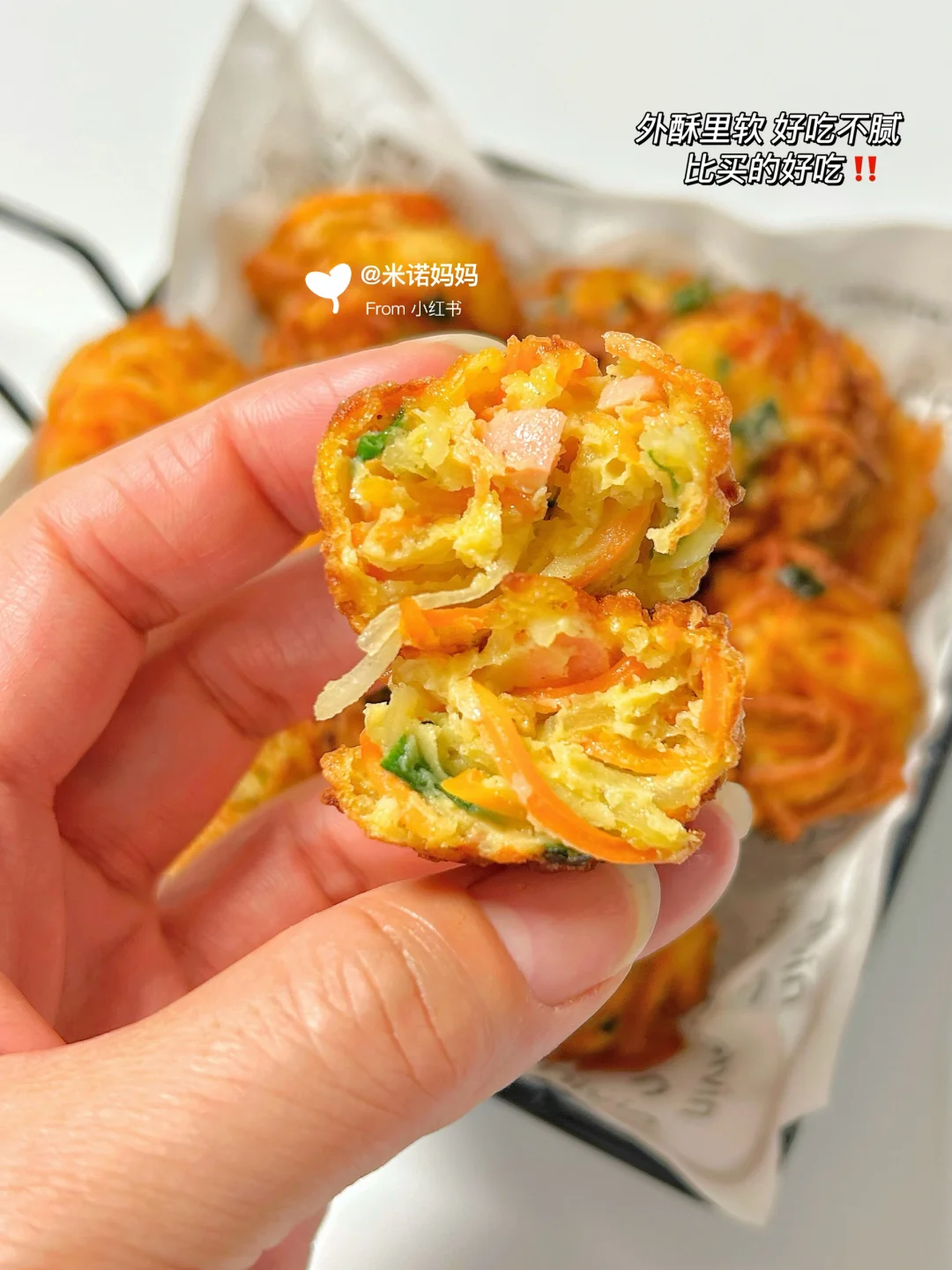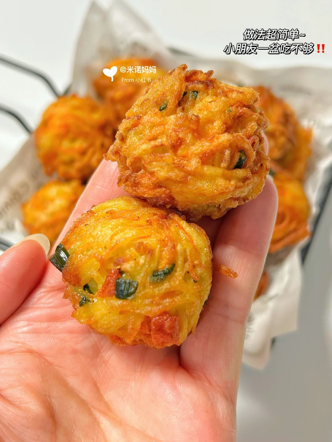 Hi 大家好呀❤️ 今天这个土豆丝火腿丸子被小朋友夸爆啦!外酥里软,小朋友一口一个,好吃到停不下来~做法超简单哦,一学就会,土豆丝加胡萝卜这个搭配真的巨好吃,快去做[派对R] - 🌈准备食材 土豆 | 胡萝卜 | 🥚蛋 | 面粉 | 香葱 👩🏻🍳具体教程请看图文哦~ ✔️火腿丁可不加~ ✔️油温七八成热下入土豆丝丸子,转中小火,炸至全部浮起金黄即可~ ✔️小朋友吃可蘸番茄酱,大人吃可撒点椒盐~ - 巨好吃的土豆丝丸子,快给小朋友安排上吧,小朋友会敲喜欢哒[拥抱R]