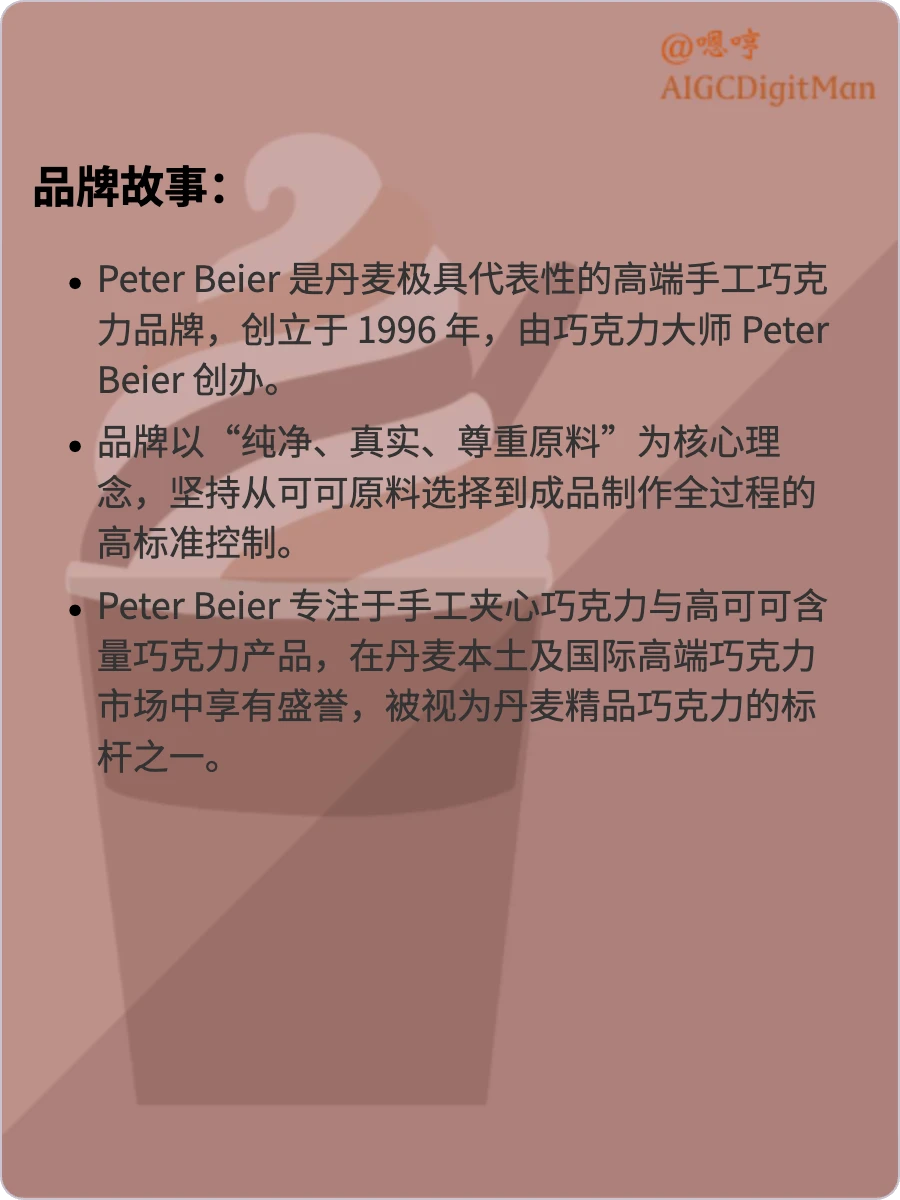 Peter Beier 专注于手工夹心巧克力与高可可含量巧克力产品,在丹麦本土及国际高端巧克力市场中享有盛誉,被视为丹麦精品巧克力的标杆之一。