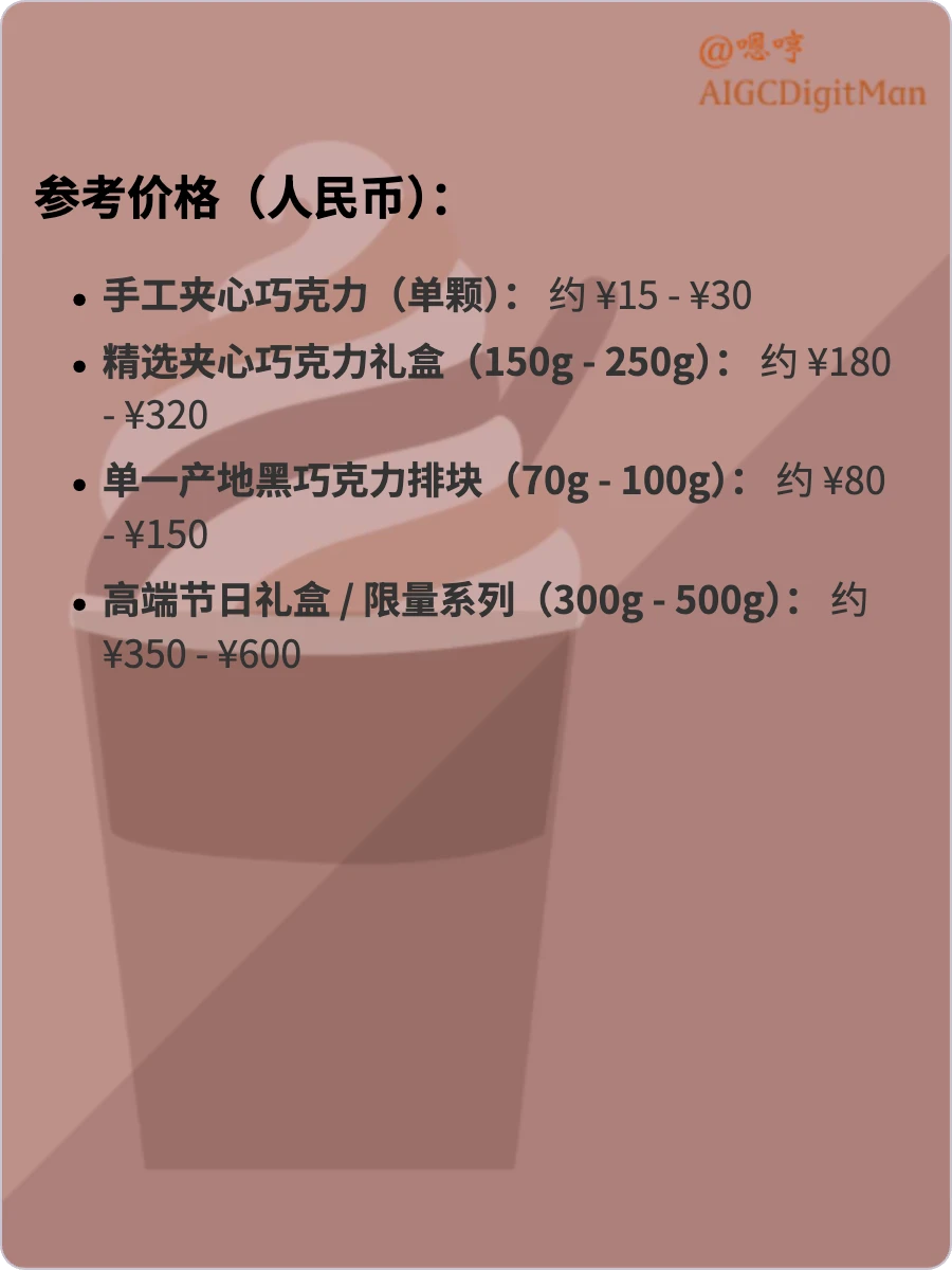 手工夹心巧克力(单颗): 约 ¥15 - ¥30