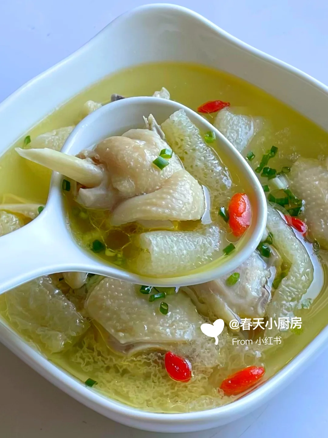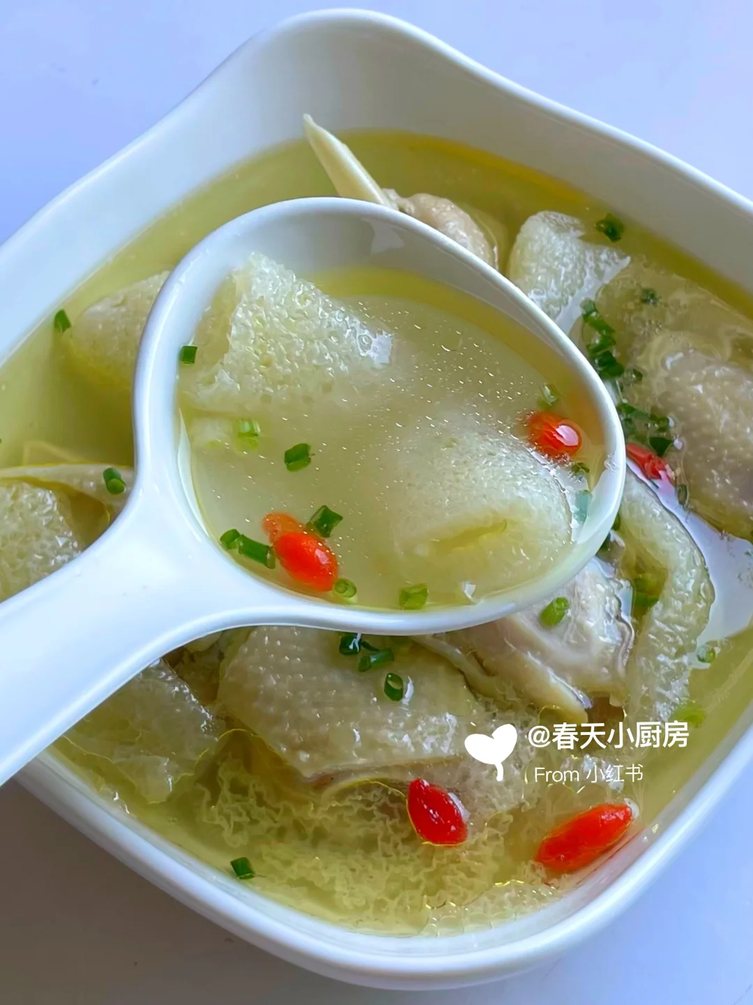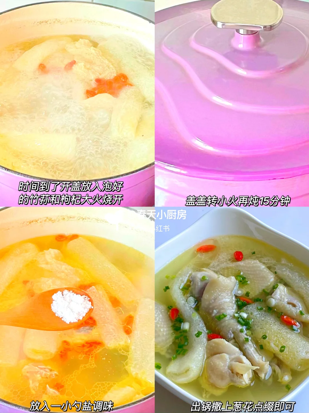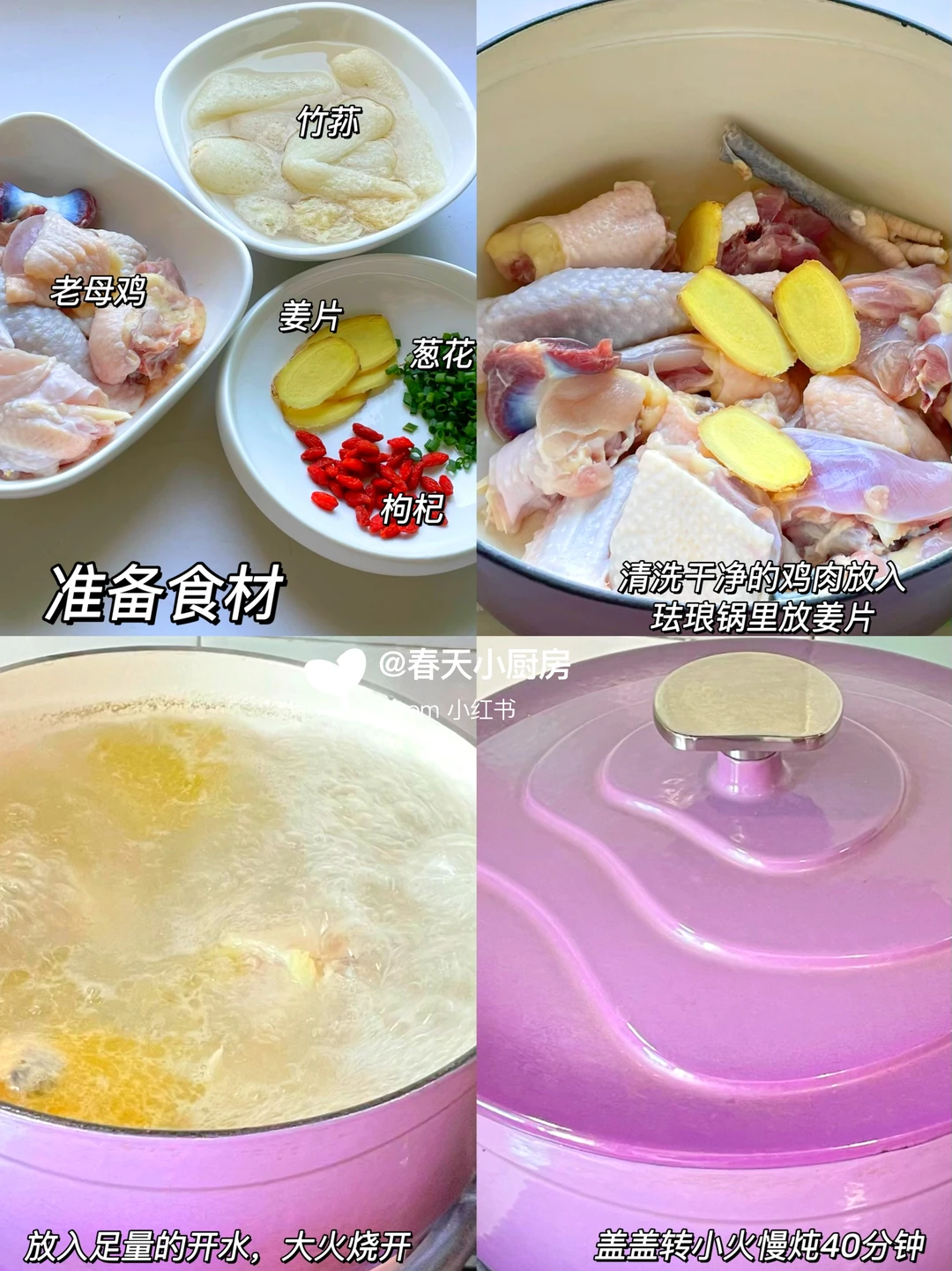 半只老母鸡、竹荪5-6根(干货为佳,菌盖完整无破损)、姜片4片、葱花适量、枸杞一小把、盐少许。