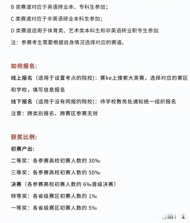26大英赛将于12月17日开启报名 大英赛会惩罚每个不看通知的懒人 1.报名时间:预计2025年12月17日开启 2.比赛时间: 初赛:2026年4月12日(周日9:00-11:00) 决赛:2026年5月10日(周日9:00-11:00) 3.大一冲大英赛=白捡国奖+奖学金拿到手软 士综测直接拉满+稳拿保研资格(姐姐当年没当班委、没进社团,靠大英赛拿了学院第一,奖学金收都收烦了) 4. 报名方式二选一: ①自己在网占报名(报名费50元) ②学校统一组织线下报名 英语四六级 当我们谈论高考时