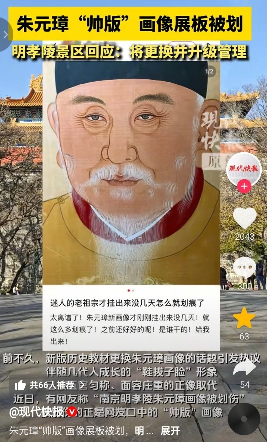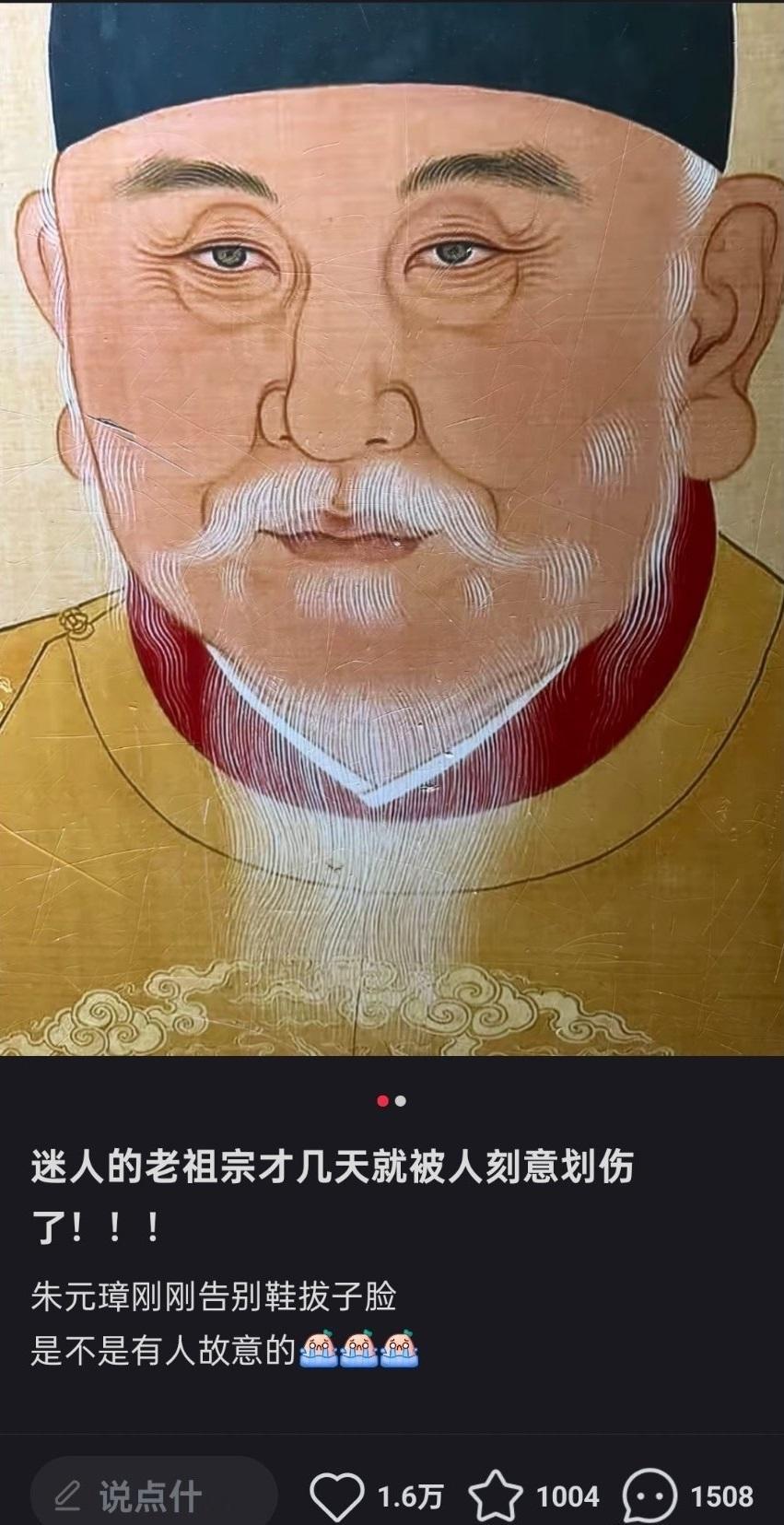 明孝陵朱元璋帅版画像展板被划 话说,朱元璋画像是“鞋拔子脸”形象的时候,明皇帝朱氏后代子孙以及广大国人就只能默默忍受着。这朱元璋的帅版画像才被挂上几天,就有别有用心的人坐不住了,竟然直接对其进行破坏,由此可见这些群体是多么的恶毒,难道这不算是“伤害中华民族的感情”?热点观点
