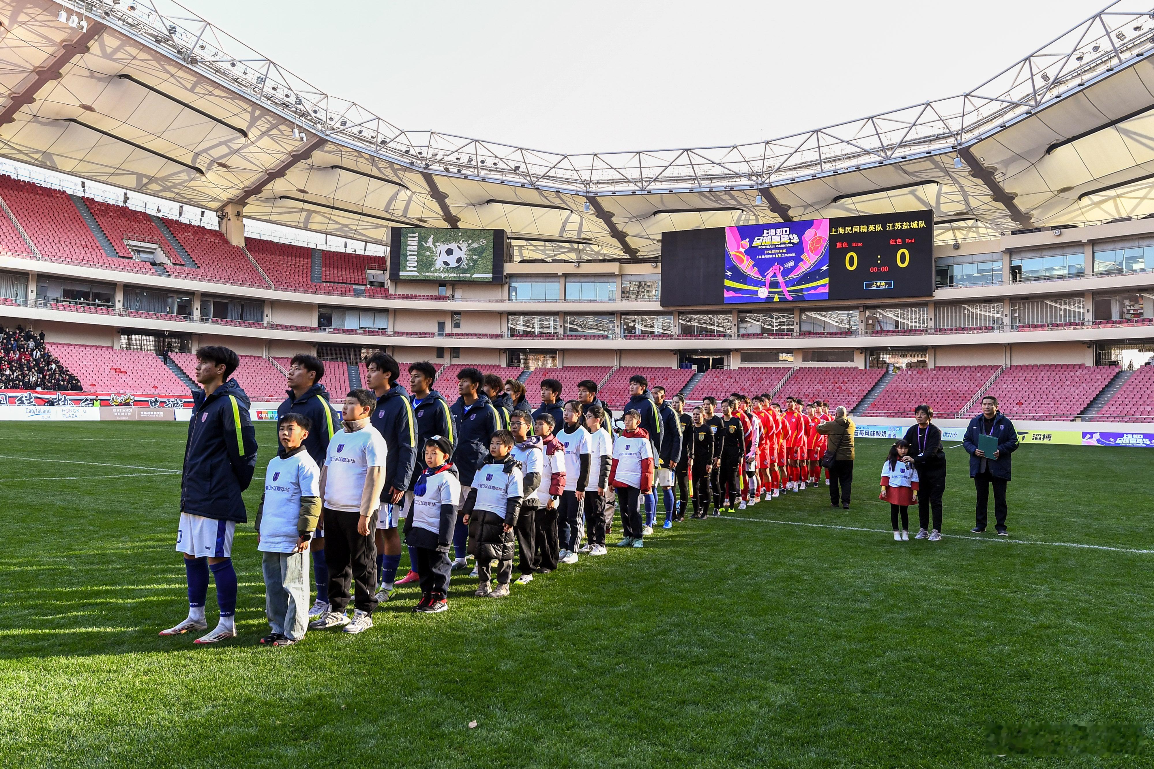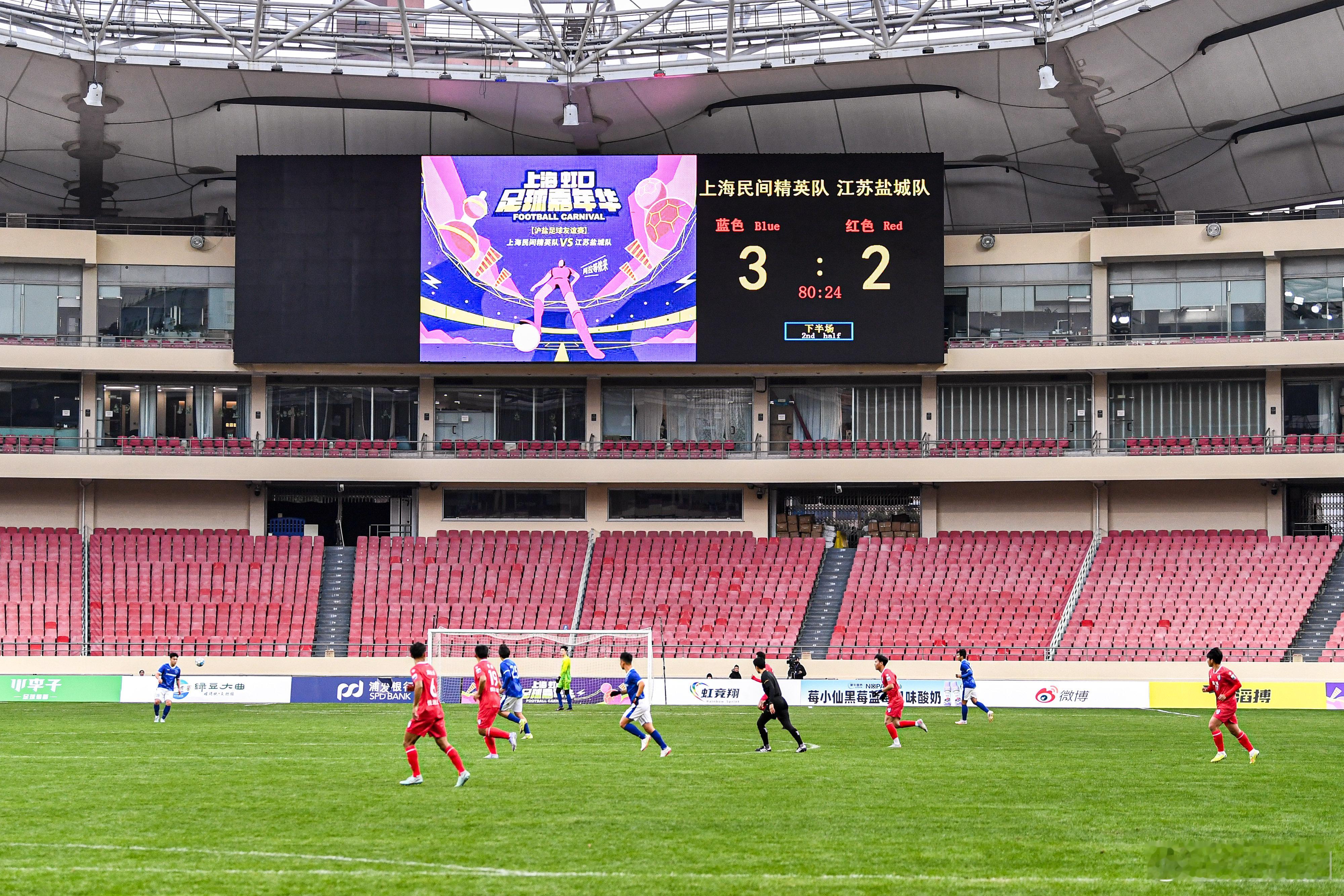 刚刚过去的这个周末,“上海虹口足球嘉年华”暨“沪盐一家,绿茵争锋”沪盐足球友谊赛在虹口足球场内场举行,奚志康、李中华、秦国荣、水庆霞等诸多沪上足坛名宿,以及刘军、虞伟亮、卞军等老申花一代球星集体献艺,还有汇集上海民间精英球员的“上超”队与“苏超”盐城队在上海滩的对决,让虹口足球场重新因为足球而热闹起来。正式比赛前,由盐城籍中国女足前主帅水庆霞领衔的上海文体明星联队与沪盐企业联队的垫场赛先一步开打。明星队中,曾经的申花中卫卞军重操中锋老本行,和李中华组成搭档,中场有水庆霞、奚志康、刘军等,后防线上有网球名将张之臻的父亲张卫华,以及黄翌、霍智宇、陆炜等,门将则是虞伟亮。最终卞军完成帽子戏法,帮助上海明星队3比2险胜沪盐企业联队。随后进行的沪盐友谊赛,盐城市体育局党委书记、局长徐丹为比赛开球,此次来沪的江苏盐城队,是盐城为2026年“苏超”联赛选出的精兵强将,为备战明年的“苏超”,盐城队的组建工作已经启动,200余名球员接受水庆霞指导为首的专家组现场考核,此次选拔的20名球员赴虹口足球场“打擂台”,正是备战来年“苏超”的一次重要热身。坐镇虹口主场的上海民间精英队,队员由朱广沪、奚志康、秦国荣、邱京巍、崔智宇等人现场考察、打分选拔产生。上半时盐城队一度以0:2落后,但下半场他们凭借积极的跑动与愈发默契的配合,最终连续追分,与东道主战成3:3。沪盐两地足球的这一次对话,最终也以这样的一个比分暂时画上句号。但两地的足球交流,这一战只是开始。上海虹口足球嘉年华
