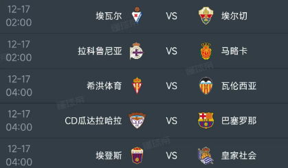 北京时间12月17日,明天西班牙国王杯迎来第三轮的较量: 第一场02:00,埃瓦尔(西乙第20名)PK埃尔切(西甲暂列第11名) 第二场02:00,拉科卢尼亚(西乙第2)PK马略卡(西甲第14) 第三场04:00,希洪体育(西乙第7)PK瓦伦西亚(西甲第17名) 第四场04:00,CD瓜达拉哈拉(西协甲A组)PK巴萨(西甲第一,也是卫冕冠军) 第五场04:00,埃登斯(西协甲B组)PK皇家社会(西甲第15名)