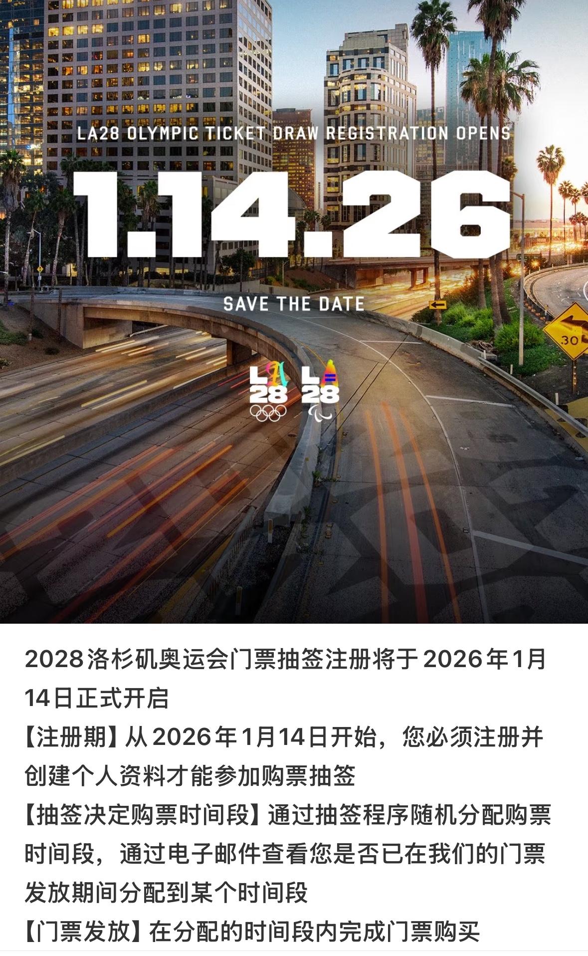 2028年洛杉矶奥运会门票抽签注册将于2026月1月14日正式开启 巴黎奥运会卖票时间是22年5月开始提前两年注册个人信息, 抽签买票! 洛杉矶奥运会这么提前注册, 居然有了三年高考的紧迫感! 乒乓球项目还不知道谁会参加,观众们先预定好了, 有一种是不是建造场馆需要 资金的感觉, 需要集资吧! 提前三年卖票, 不会拿这个钱做启动资金吧!