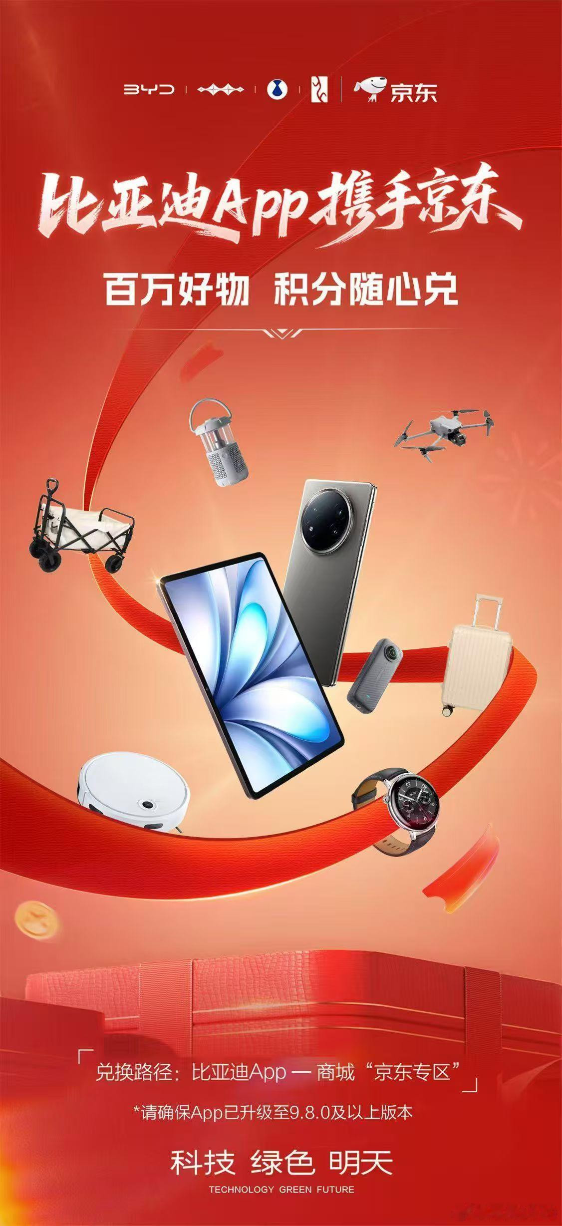 APP积分支持兑换京东好物啦!积分不闲置,零食家电样样有百万“京”选好物,解锁生活小美好即刻打开比亚迪APP,玩转积分~