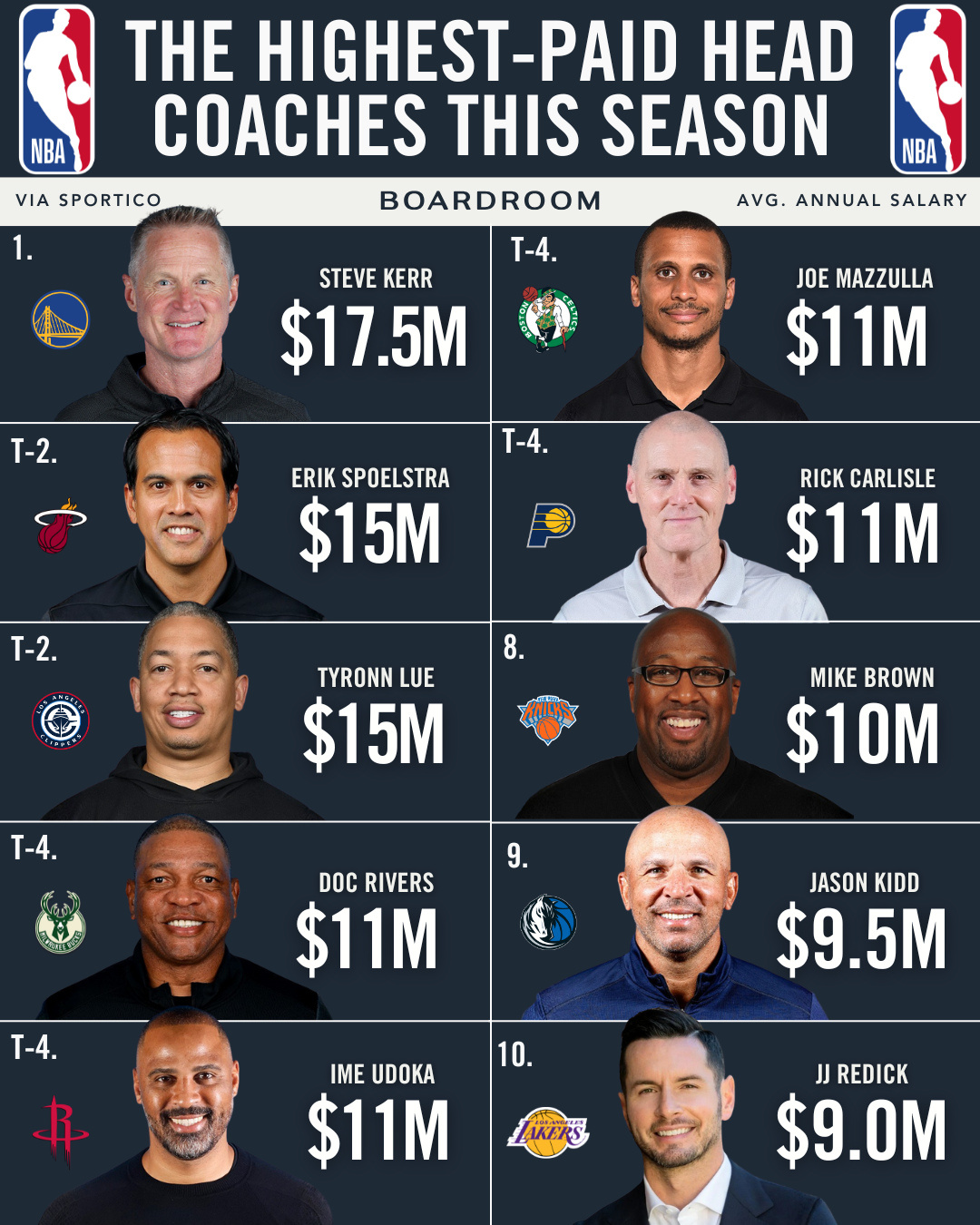 数据媒体Sportico罗列本赛季主教练年薪前十:1,科尔(勇士)1750万2,
