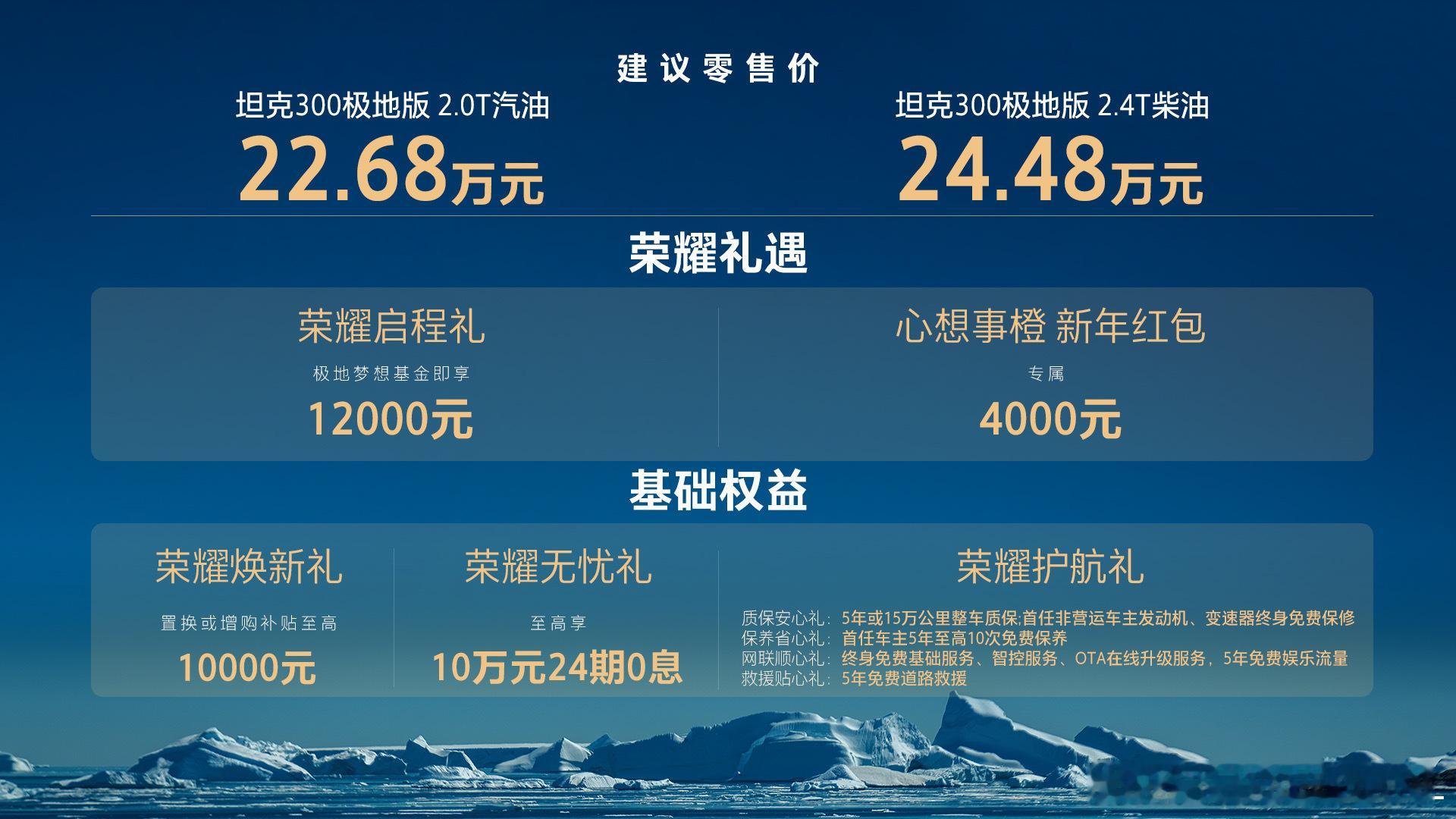 注意到坦克300全球已经有50万用户啦!之前去西藏5000多米海拔的国王峰时,我就租了个坦克300,确实很可靠。如今坦克300的第14款车型极地版终于上市啦,售价22.68万元-24.48万元,并且标配极地装备。开启预定15分钟内300台限额全部售停。最近觉得越野还蛮有意思的,大家说我要不要也整台坦克玩玩?坦克300