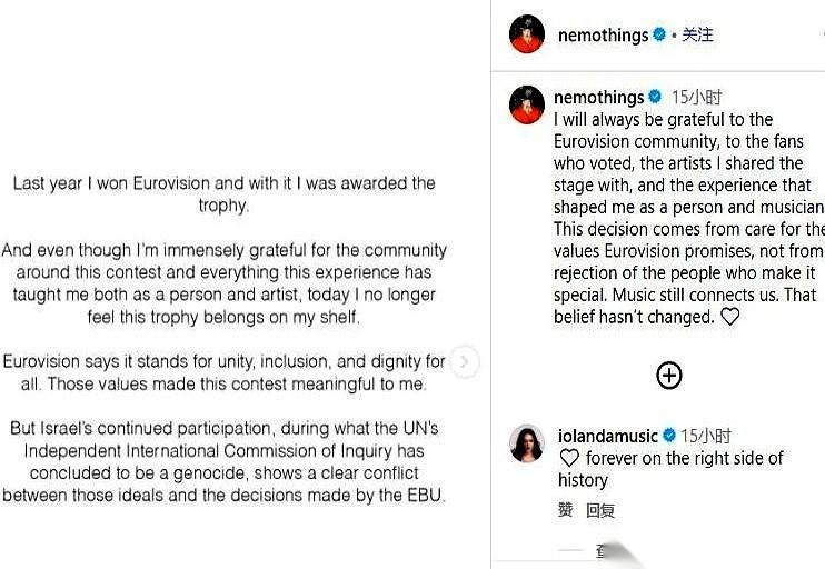 冠军把奖杯给退了。 装在箱子里,说要寄回去。 我跟你说,这事儿可太硬核了。 那可是欧歌赛的冠军奖杯啊,水晶麦克风,全球1.6亿人看着你捧起来的荣耀。多少人挤破头都想摸一下的玩意儿。 结果瑞士小哥Nemo,去年刚拿了冠军,转头就说:这玩意儿,不配放我书架上了。 膈应。 为啥? 因为主办方非要让以色列参加下一届比赛。一边是号称“团结、包容”的音乐盛典,一边是加沙正在发生的人道悲剧。Nemo觉得,这太分裂了,太虚伪了。 他说得特直白,我不想自己的艺术,变成给某些行为“洗白”的工具。 就这么简单。 真的,这一下比任何抗议都有劲儿。 这已经不是音乐了,这是在拷问良心。一个艺术家最珍贵的,除了才华,不就是这点风骨吗? 主办方说遗憾,以色列说这是“胜利”。 可这份“胜利”,在人家退回来的奖杯面前,怎么看怎么像个天大的笑话。你赢了资格,却输掉了所有人的尊重,尴尬不? 最扎心的是Nemo最后说的那句话: “如果舞台上歌颂的价值观,在舞台下无法践行,那再动听的歌,也毫无意义。” 这话,扇了多少人的脸啊。