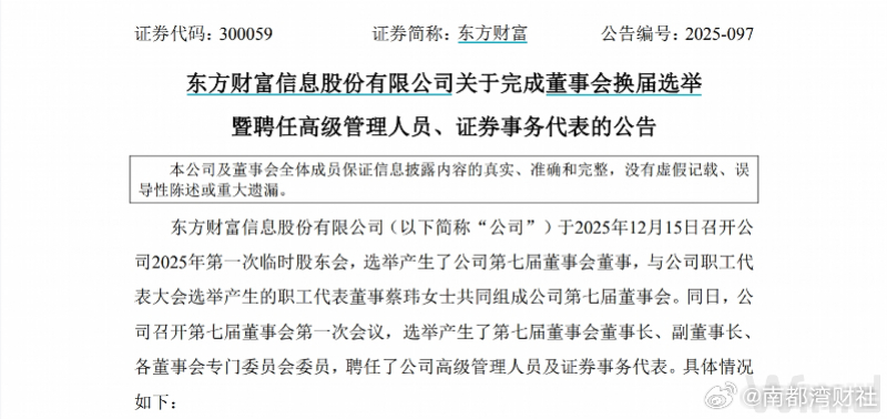 #东方财富调整架构# #黄建海获任东方财富总经理#【东方财富“70后女将”黄建海获任总经理,公司架构改革开启】12月15日盘后,东方财富(300059.SZ)发布系列公告。根据公告,东方财富12月15日先后召开股东会及董事会。新一届高管名单正式出炉,并明确了管理架构改革。根据公告,其实继续担任东方财富董事长,东方财富原财务总监、董秘黄建海升任副董事长、总经理,郑立坤卸任东方财富总经理后,继续担任子公司东方财富证券董事长。除高管人事变动外,东方财富的组织架构也同时进行了调整。东方财富最新公布的组织架构图显示,总经理下辖的部门包括财富管理事业群、创新业务事业群、人工智能事业部、业务支持中心、研发中心等12个部门。#东方财富架构大调整# 东方财富“70后女将”黄建海获任总经理,公司架构改革开启