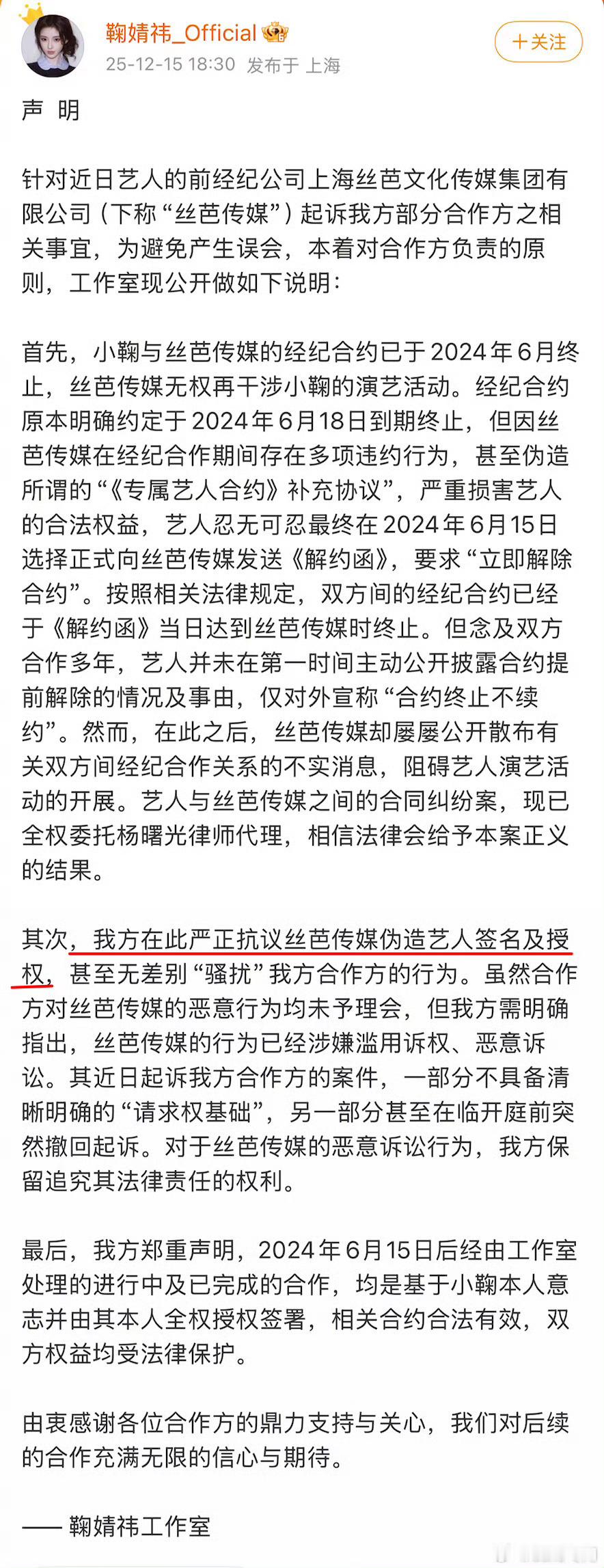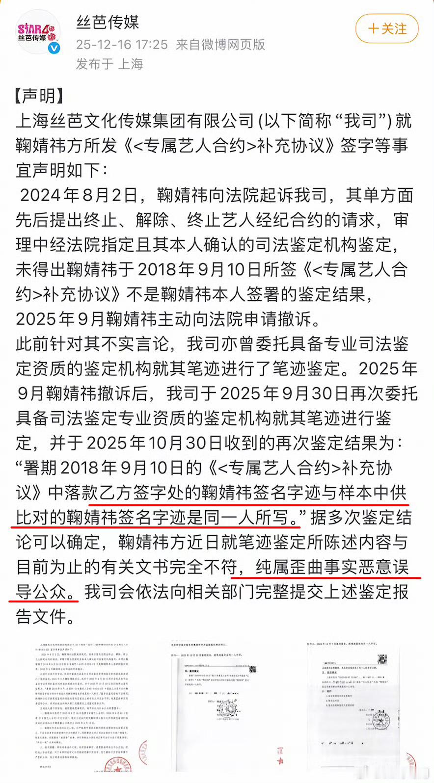 谁在栽赃谁在陷害?鞠婧祎方说丝芭伪造艺人签名,丝芭说经过司法专业鉴定机构鉴定签名出自同一人,鞠婧祎方歪曲事实。