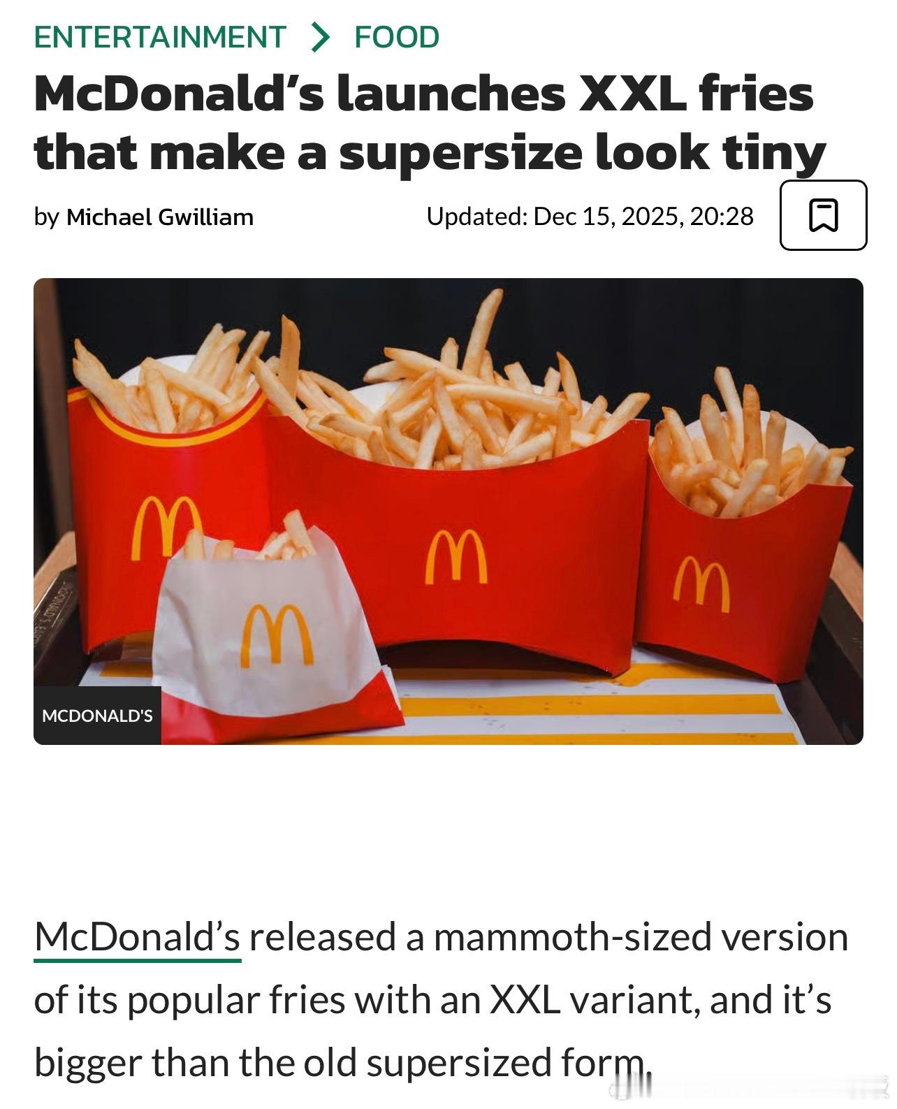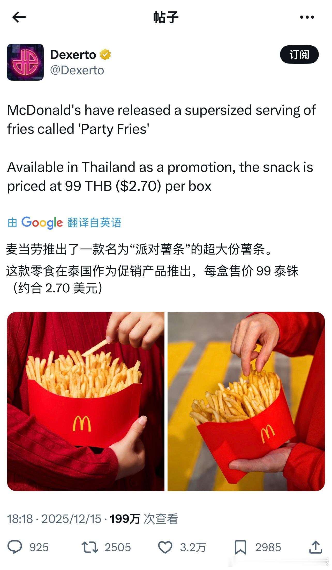 麦当劳推出了一款名为“派对薯条”的超大份薯条。这款零食在泰国作为促销产品推出,每盒售价 99 泰铢(约合 2.70 美元)😭
