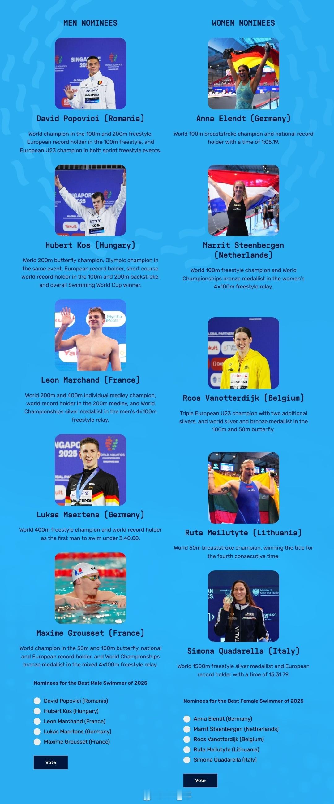 欧泳联公布2025年欧洲最佳男女运动员提名男子🇹🇩David Popovici🇭🇺Hubert Kos🇫🇷Leon Marchand🇩🇪Lukas Martens🇫🇷Maxime Grousset女子🇩🇪Anna Elendt🇳🇱Marrit Steenbergen🇧🇪Roos Vanotterdijk🇱🇹Ruta Meilutyte🇮🇹Simona Quadarella 泳迷可在12.16-31号期间通过链接投票网页链接