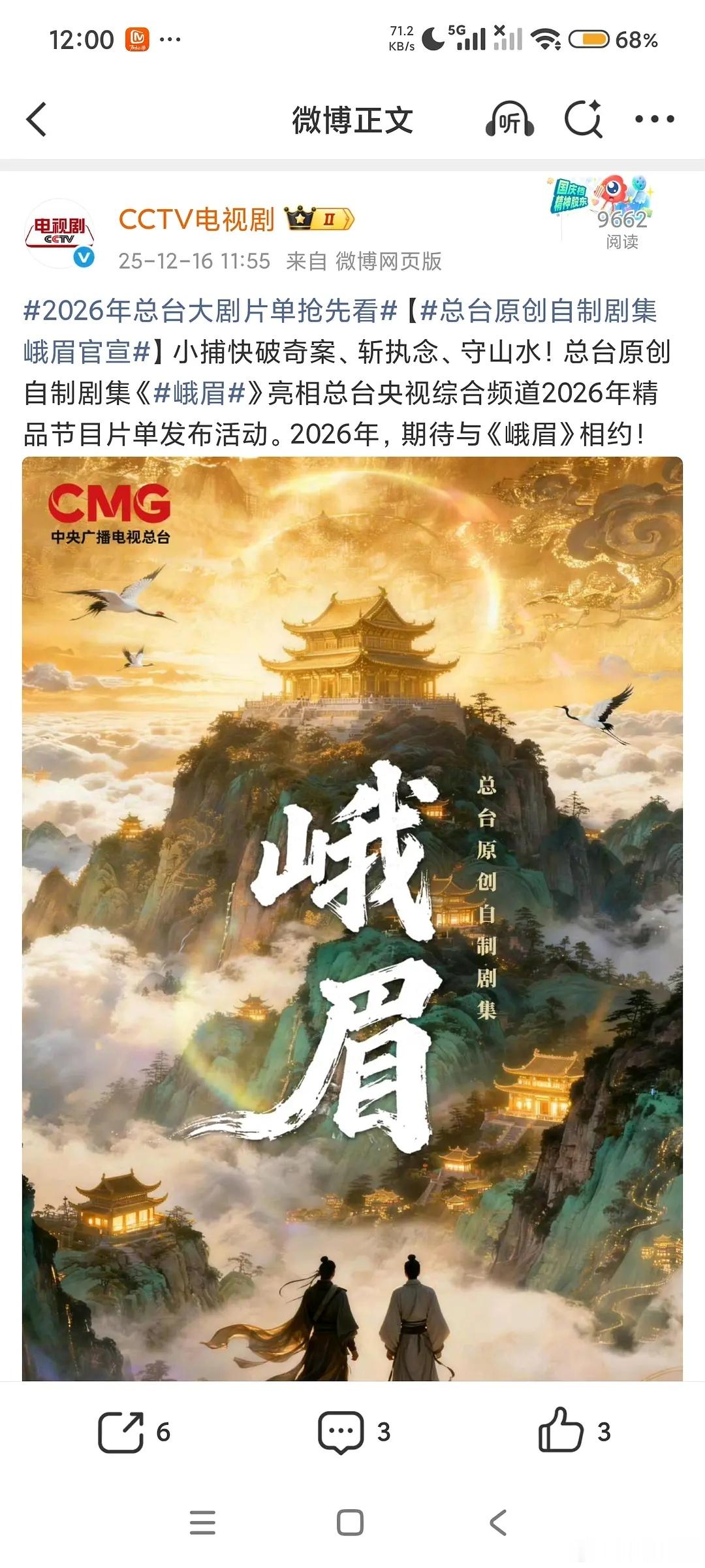 央视自制古装双男主探案悬疑剧《峨眉》,CCTV1播出今天央视一套片单发布活动,发布多个综艺晚会和电视剧,大多数都是已知片单,其中有一个片单就是央视自制古装剧《峨眉》,预计明年开播,播出平台暂定CCTV1