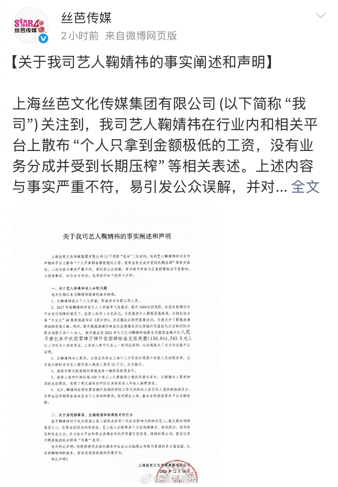 【#丝芭回应鞠婧祎收入争议#】#丝芭称已支付鞠婧祎超1.39亿# 12月16日,发布【关于我司艺人鞠婧祎的事实阐述和声明】,上海丝芭文化传媒集团有限公司(以下简称“我司”)关注到,我司艺人鞠婧祎在行业内和相关平台上散布“个人只拿到金额极低的工资,没有业务分成并受到长期压榨”等相关表述。上述内容与事实严重不符,易引发公众误解,并对我司声誉与正常经营造成不良影响。为澄清事实、回应各方关切,我司现作如下说明与声明。(星视频)#鞠婧祎收入#