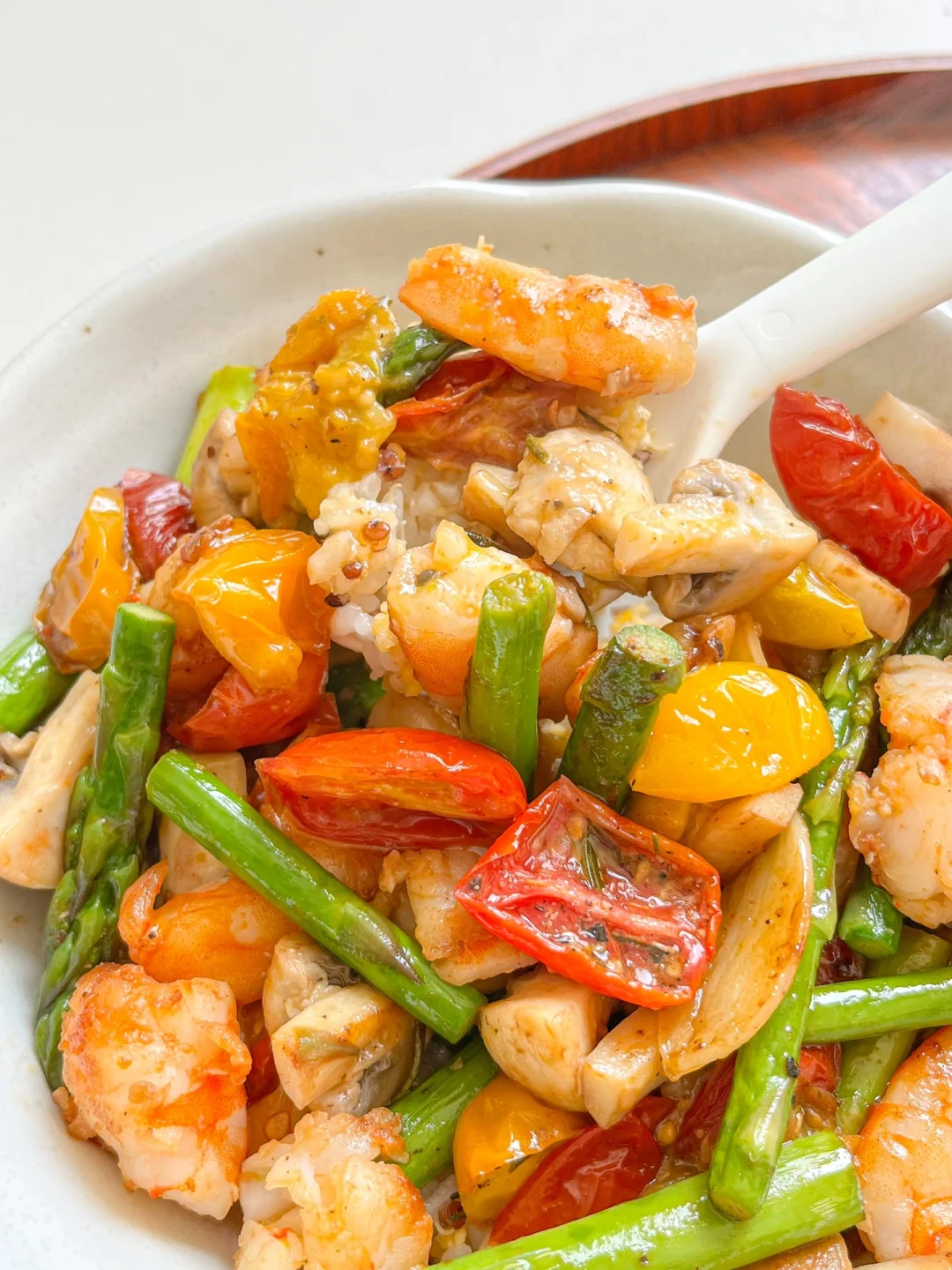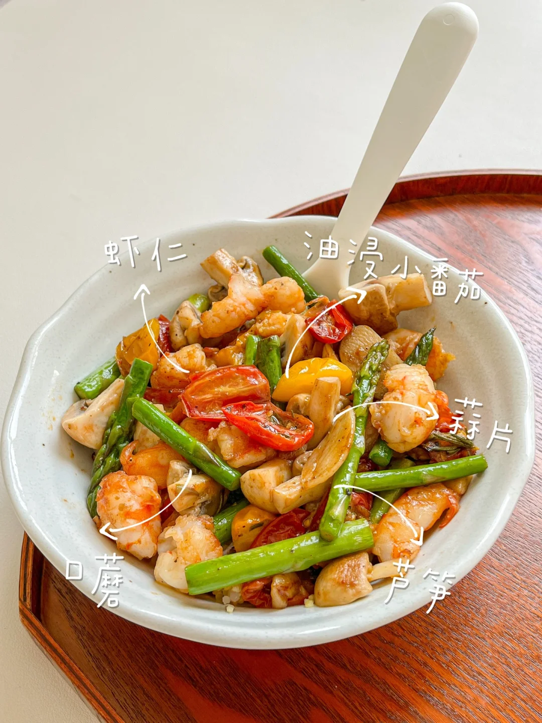 现在正是吃芦笋的季节,春天鲜嫩的芦笋和虾仁好搭啊~还放了口蘑、油浸小番茄酸酸甜甜的,跟杂粮米饭拌着吃真的太赞了!做油浸小番茄的时候调了味,所以这道菜也基本不用放盐了。芦笋焯水的时候加点盐就足够了~