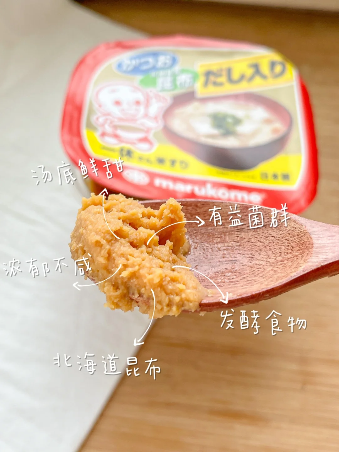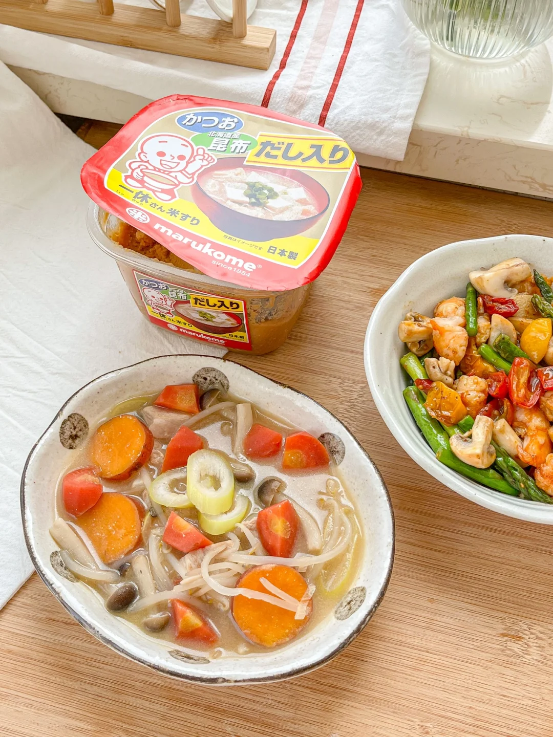 味噌是一种黄豆发酵食物,里含有丰富的蛋白质、氨基酸和食物纤维,可以经常喝一碗味增汤~marukome盒装版新添加了北海道昆布,味道更鲜甜了,也不咸。味增不耐煮,所以把喜欢的蔬菜先煮熟,最后再放味增酱,用滤网化开,煮1分钟就可以啦[萌萌哒R]
