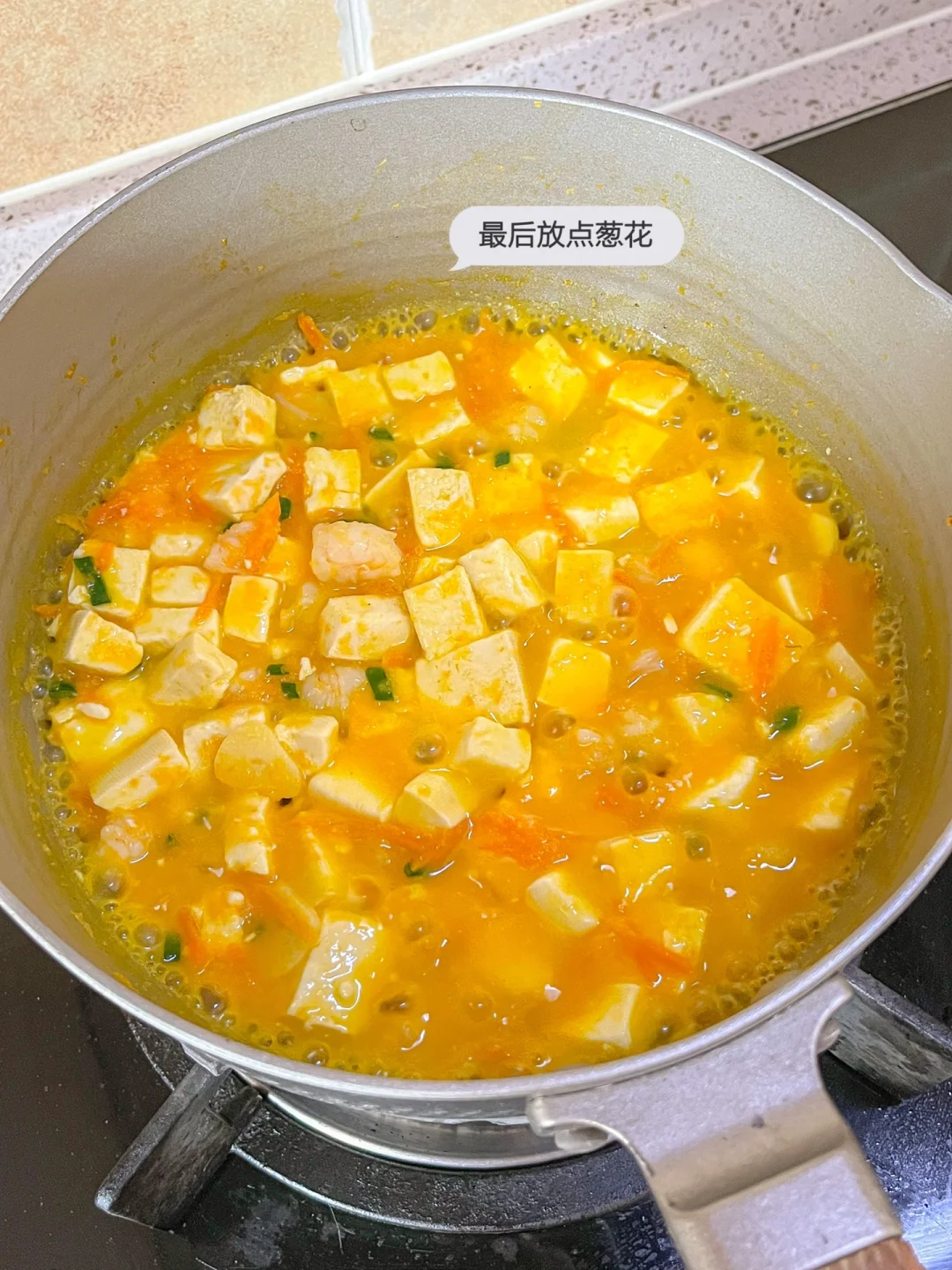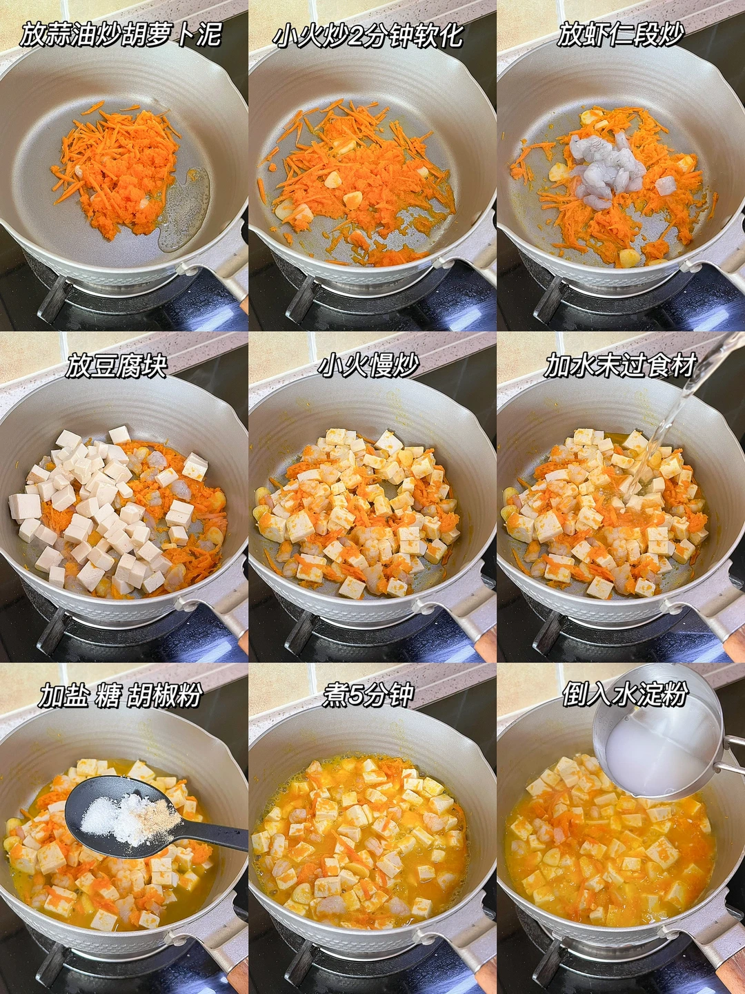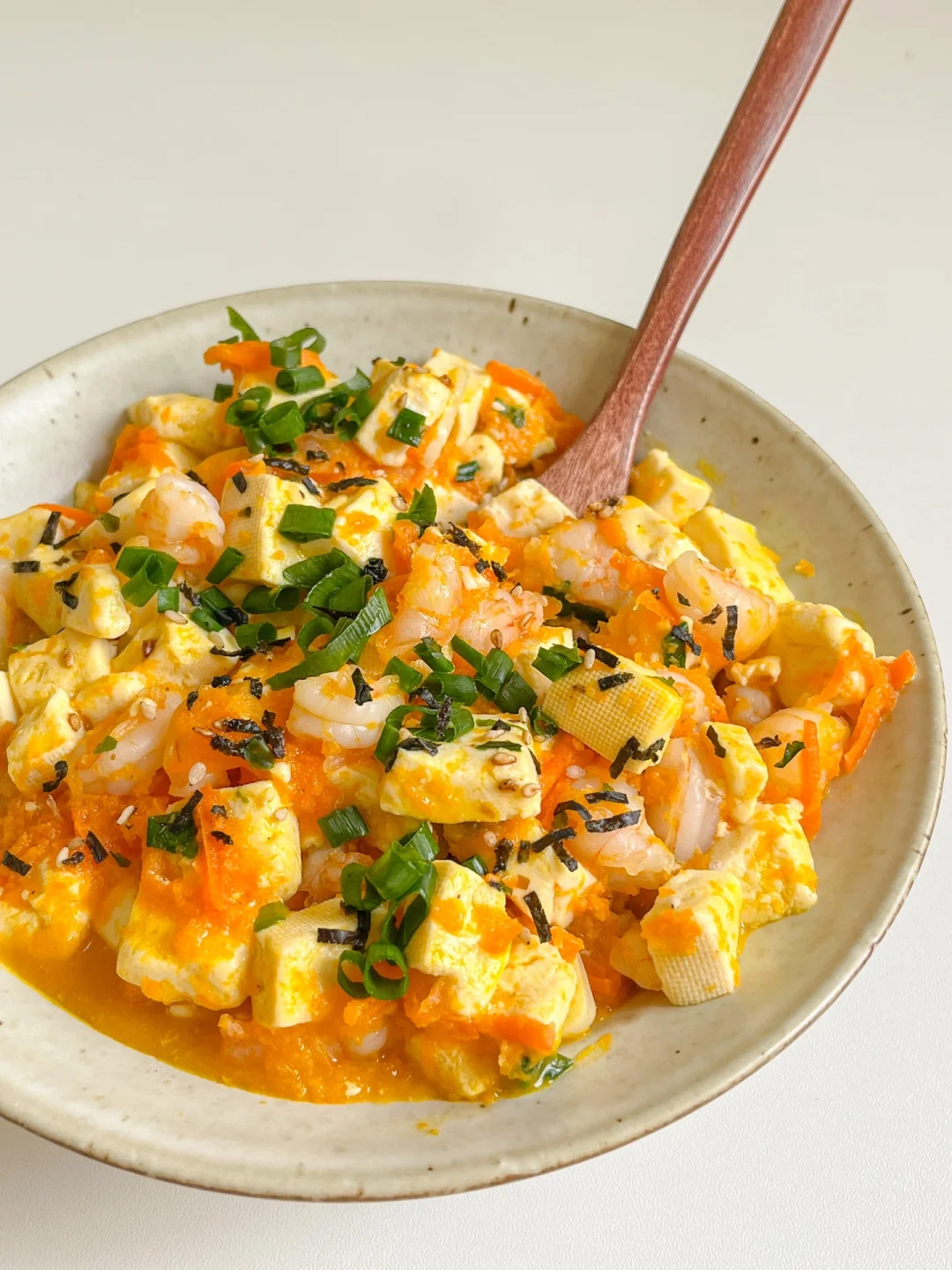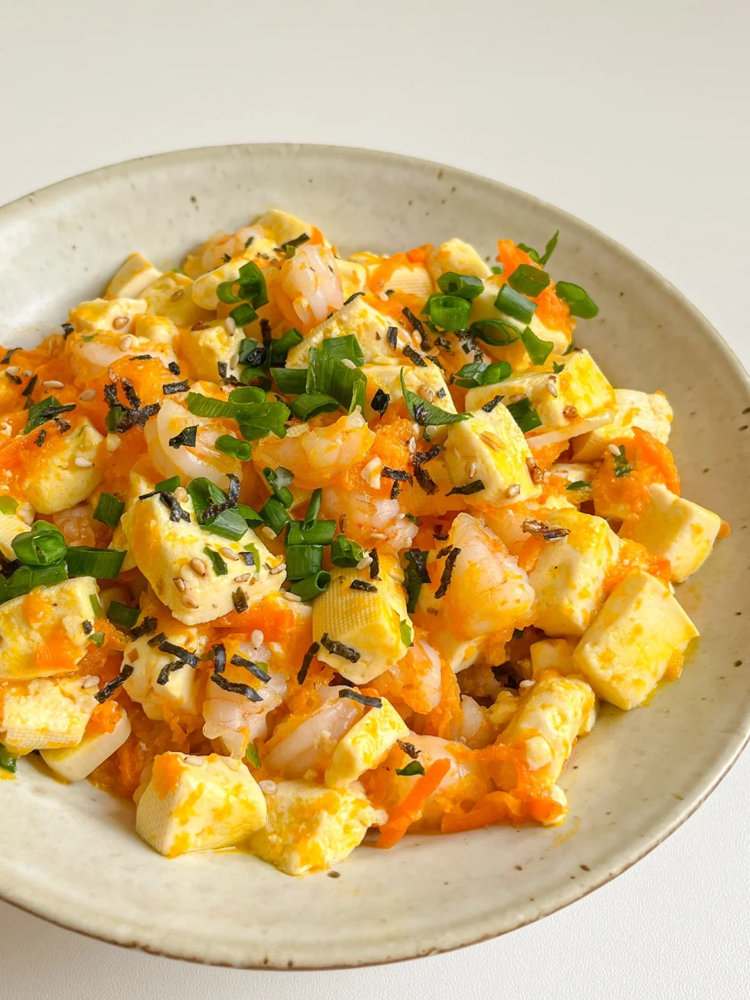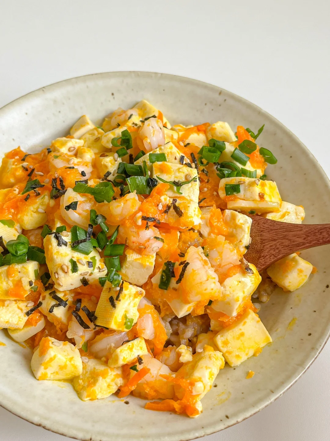 豆腐、胡萝卜、虾仁、杂粮饭、小葱