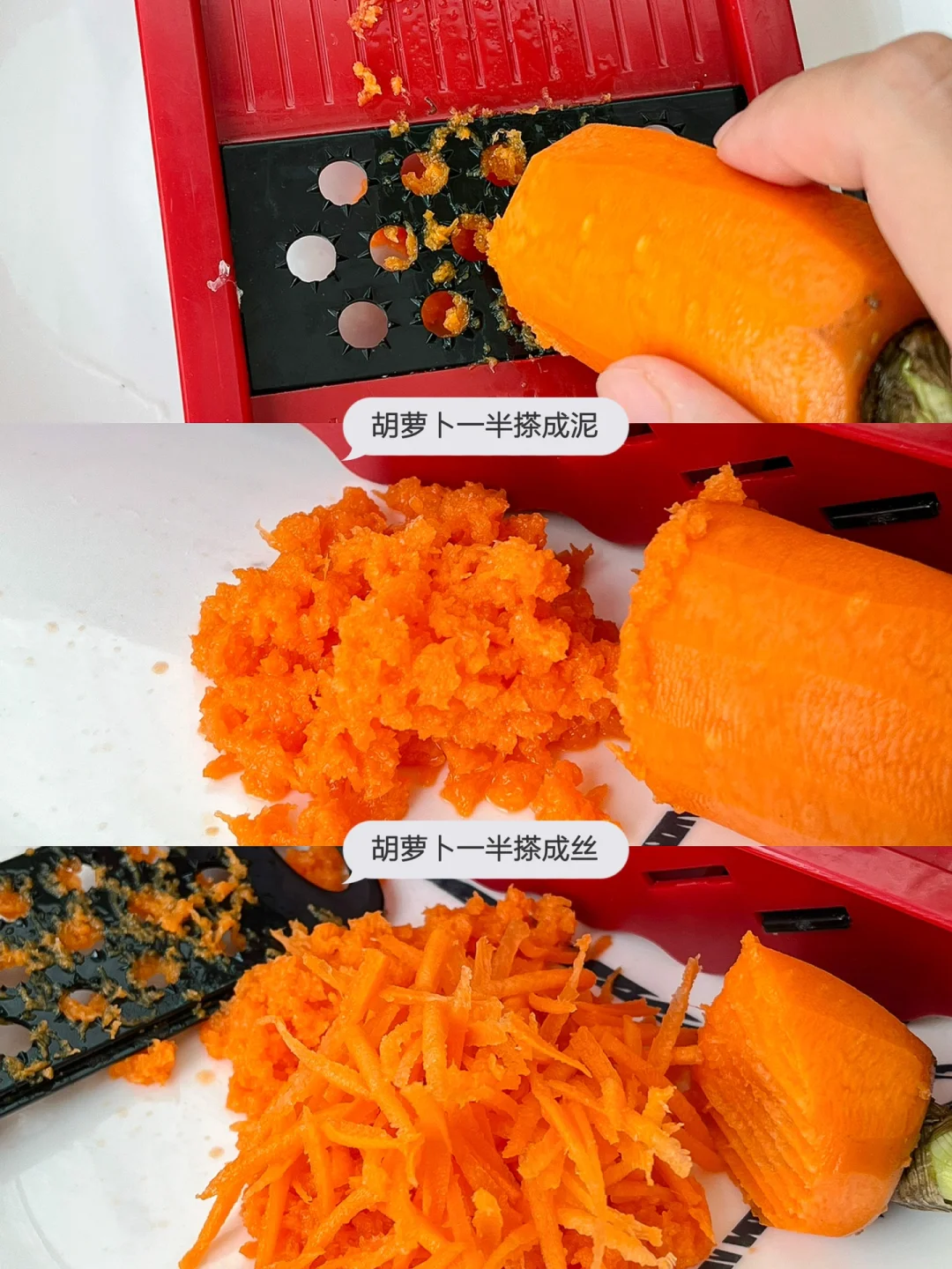 ❶胡萝卜洗净去皮,一半搽丝、一半搽泥
