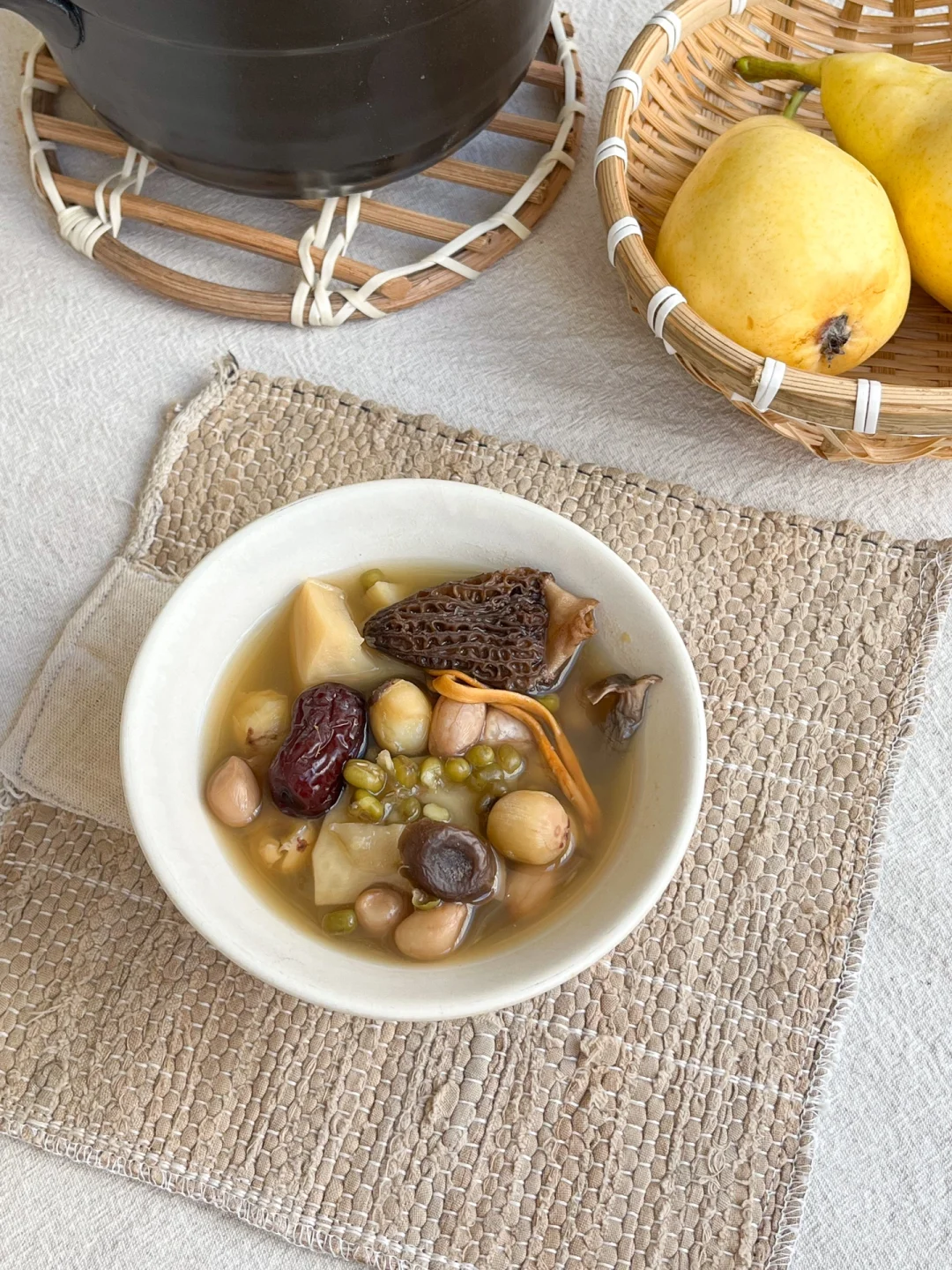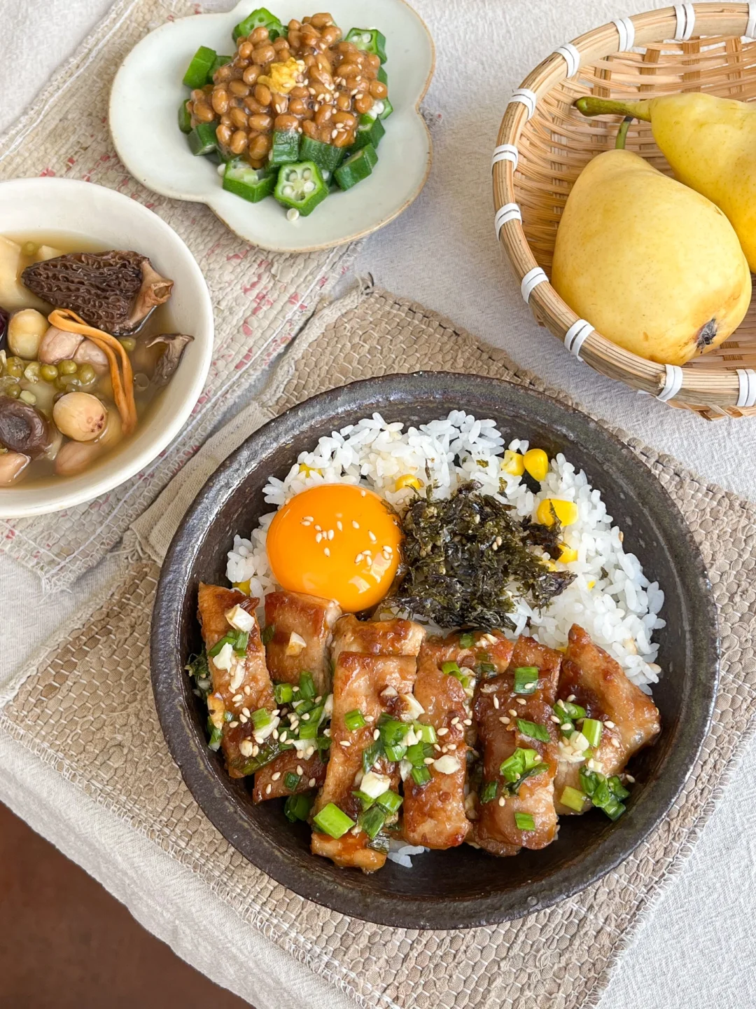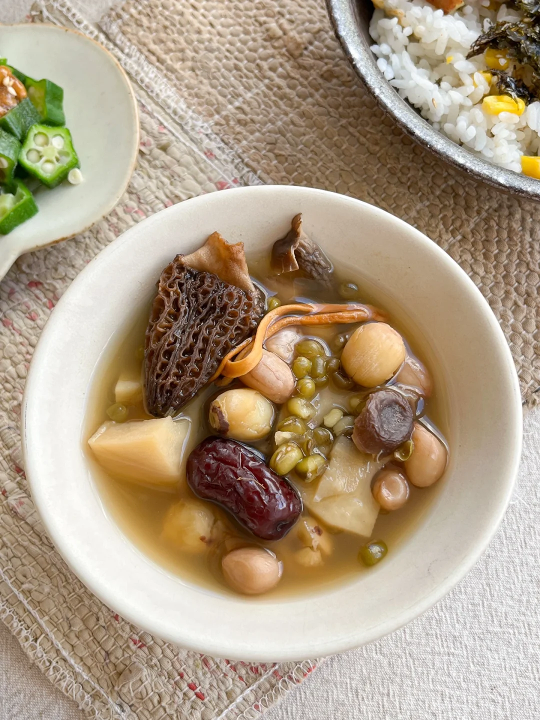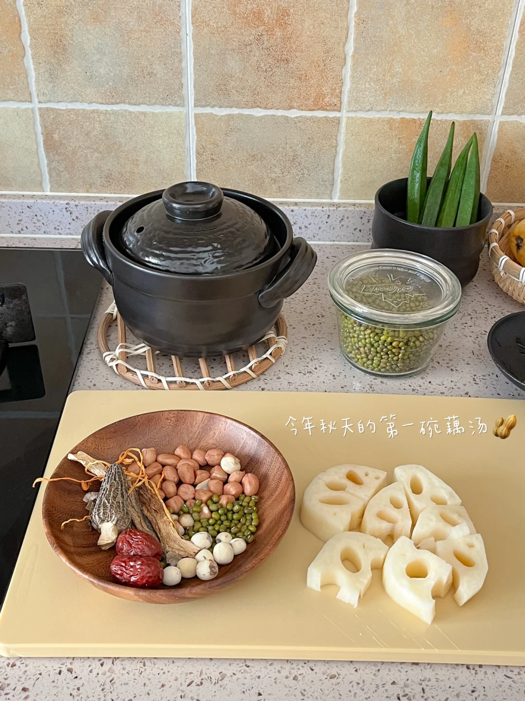 🧾午餐: 葱盐猪排饭🍛 绿豆花生藕汤🥜 纳豆秋葵🧆 茉莉花豆乳🍂 秋天得吃点新鲜的莲藕 那午餐就煮个花生绿豆莲藕汤吧 🥜花生绿豆莲藕汤 菌菇稍放一点 也不会抢莲藕的鲜甜 花生和绿豆不能少 尤其是绿豆 调味只放了一丢丢盐🧂 味道好极了! 这一小锅我自己全都喝光光 🧆纳豆秋葵 这两个都属于黏糊糊国王的 一点酱油和黄芥末就够味 可下饭呢