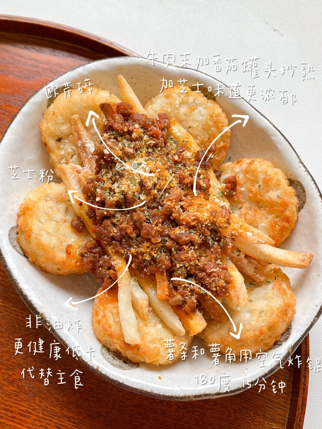 薯条和薯角用空气炸锅,不要油炸,热量不会很高,偶尔代替主食是OK的~牛肉馅加洋葱末炒香,加番茄罐头小火煮10分钟。最后放上芝士粉和欧芹碎,减脂期也能拥有的小小快乐~