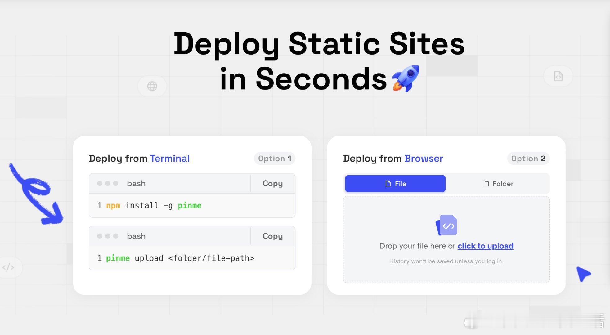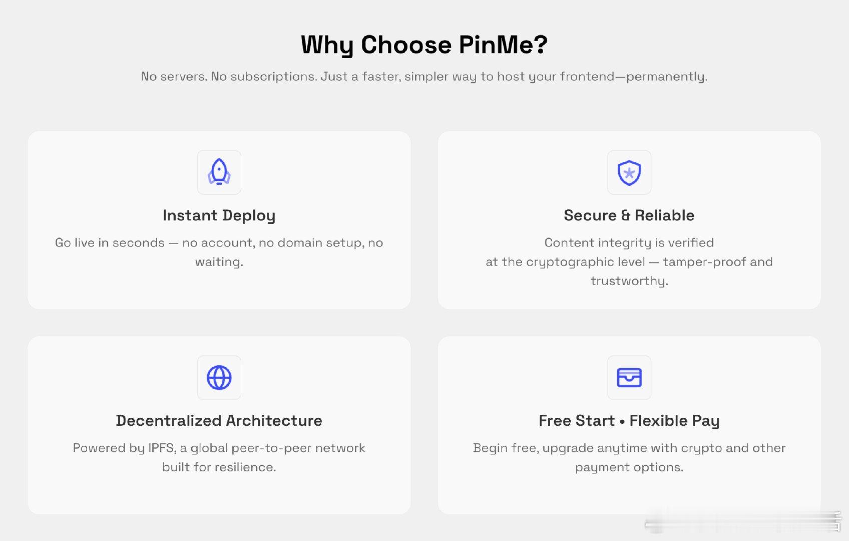 前端项目部署总是要花时间配置服务器、注册账号、搞复杂的流程,效率低还容易出错。PinMe 是一个零配置的前端部署工具,只需一条命令就能完成静态网站或前端应用的发布。无需服务器,无需账号,无需繁琐设置,快速便捷。它将你的站点发布为可验证内容,大幅降低被篡改和意外损坏的风险,同时自动保障内容的可用性和持久性。支持上传文件或整个目录,绑定自定义子域名,还能结合 GitHub Actions 实现自动化 CI/CD 部署,适合个人开发者和团队项目。GitHub 地址:github.com/glitternetwork/pinme主要功能:- 零配置,简单一条命令完成部署;- 支持静态站点、前端框架项目及 AI 生成页面;- 自动发布到去中心化 IPFS 网络,内容可验证;- 支持绑定 PinMe 子域名,方便访问;- 提供上传历史管理与文件删除功能;- 支持 GitHub Actions 集成,实现自动构建和部署。安装方式:```bashnpm install -g pinme 或者yarn global add pinme```使用体验流畅且安全,让前端部署变得前所未有的轻松。适合想快速上线网站的开发者和团队。