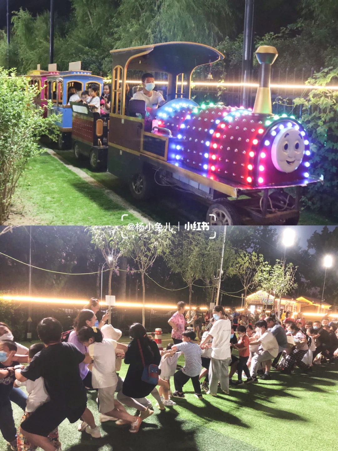 各种网绳攀爬架可以放电,有个巨大的沙池,沙子随便玩儿个够,还有滑梯、蹦床、跷跷板、秋千和各种小装置,门口的音乐喷泉还可以玩儿水。周末赶上了拔河比赛,有小朋友场和家庭场,特别有意思。关键是小火车免费!