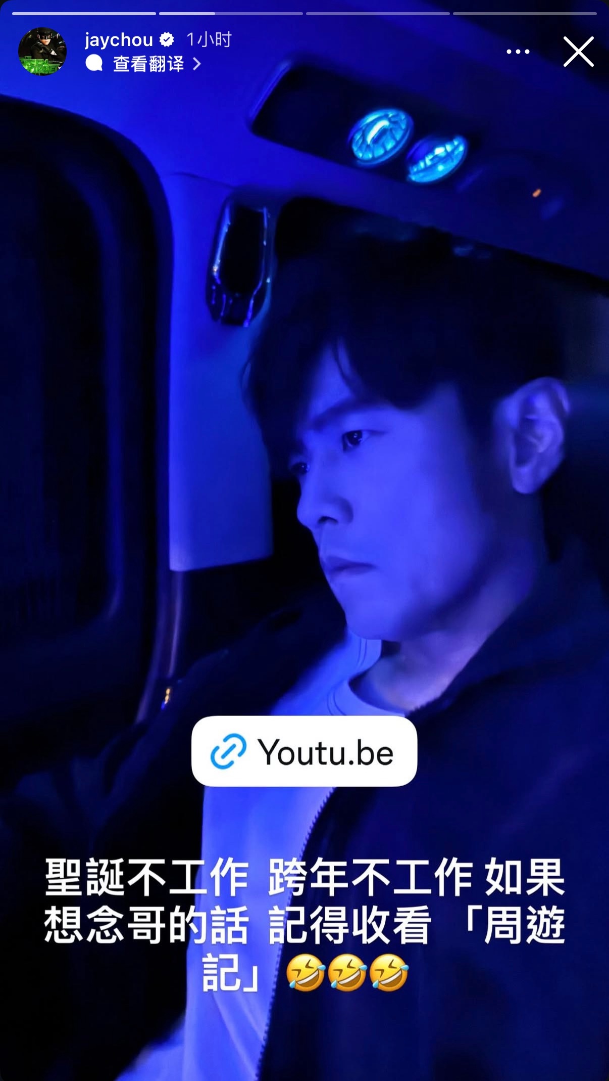 杰伦:圣诞不工作跨年不工作如果想念哥的话记得收看「周游记」🤣🤣🤣