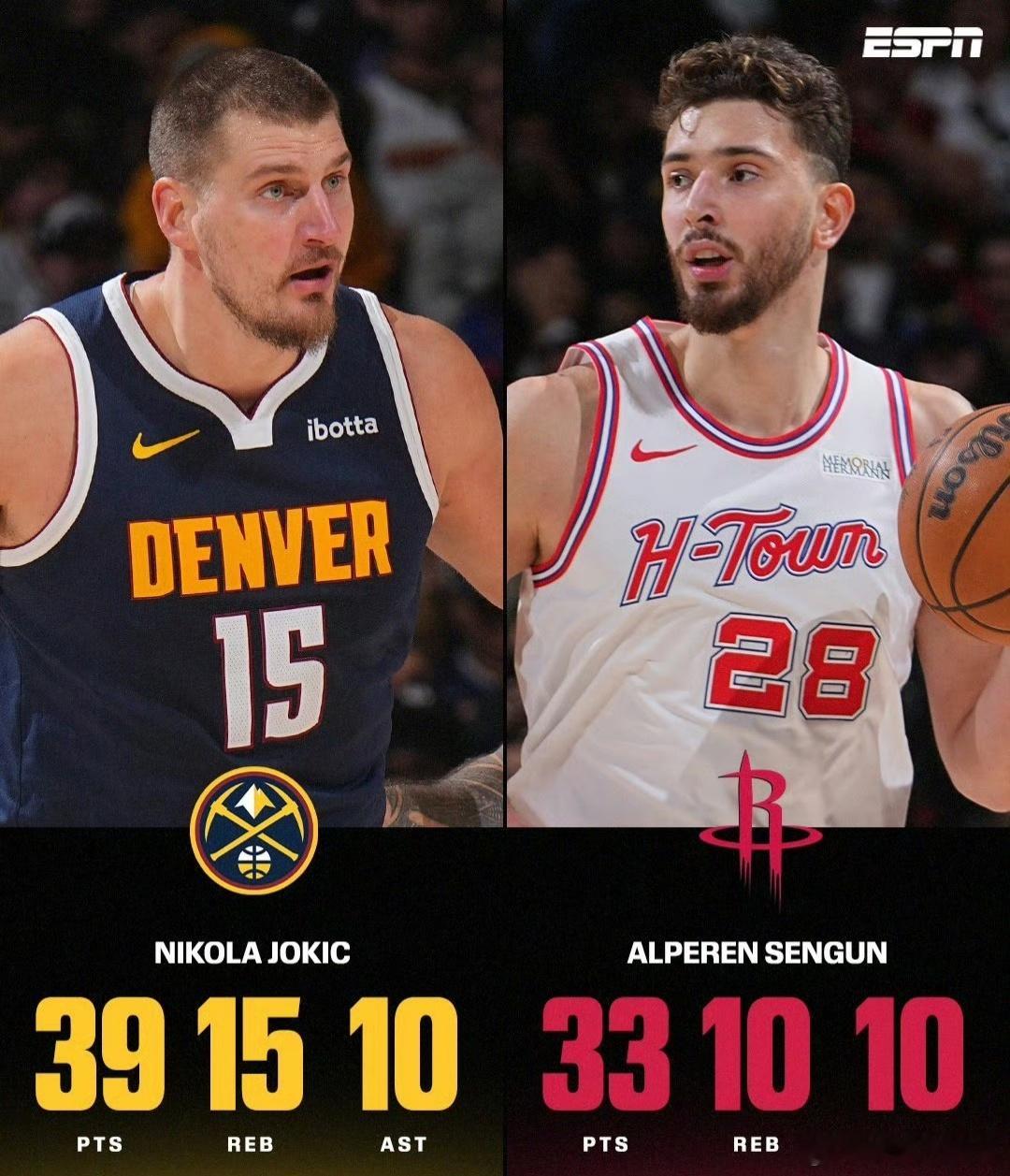 看了约基奇跟申京今天的表现,才知道申京跟约基奇一样头脑容易发热!约基奇今天全场出战42分钟,砍下39分15篮板10篮板2抢断1盖帽4失误6犯规,投篮27投13中,投篮命中率48.1%!三分9中5,罚球11中8!本场比赛约基奇拿到本赛季第12次三双联盟第一,生涯第176次三双,生涯第49场30+三双与东契奇并列第一,第13次单场35+15+10与大O并列第一!在第三节第四节分别拿下13分、12分,末节关键绝杀三分未中,比赛进入加时,而加时两次犯规,让自己6犯毕业下场!申京今天全场出战42分钟,砍下33分10篮板10助攻2抢断1盖帽4失误5犯规,投篮27投14中,投篮命中率51.9%!三分2中0,罚球6中5!本场比赛申京拿到本赛季第1次三双,超越威少成为火箭队史三双榜第三位,仅次于哈登跟奥拉朱旺,生涯至今三双累计9次!在第一节跟第四节单节分别拿下10分、12分,在末节关键时刻的勾手上篮反超两分,无奈在加时赛两次无视杜兰特,自己当英雄,在时间还剩6.8秒的时候,接边线发球,无视队友,转头就投三分,投了个没沾框的三分!亲手绝杀自己的球队!为什么说申京跟约基奇一样脑热呢?约基奇众所周知,在之前撞莫里斯,拍佩恩的脸等等,而申京也一样,在关键时刻的各种脑热行为,真的让人百思不得其解?而这场两人同时砍三双也造就NBA历史上首次出现两位中锋在同一场比赛中均砍下30+得分的三双。约基奇关键时刻被罚下约基奇申京