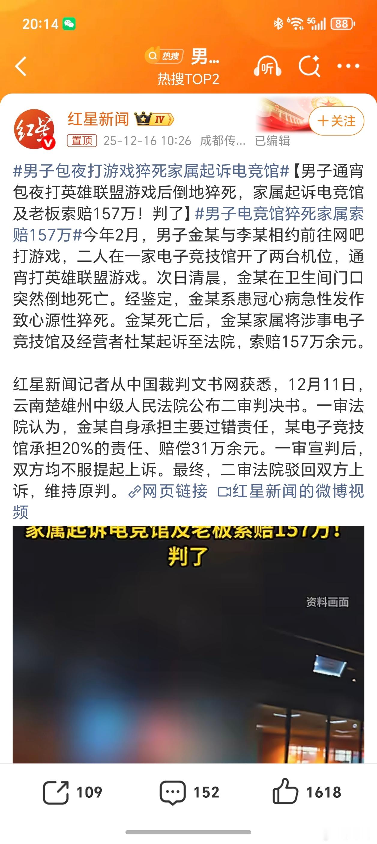 男子电竞馆猝死家属索赔157万原来电竞馆晚上不关门也是属于违法的。凌晨十二点到早上八点之间不能营业。。。