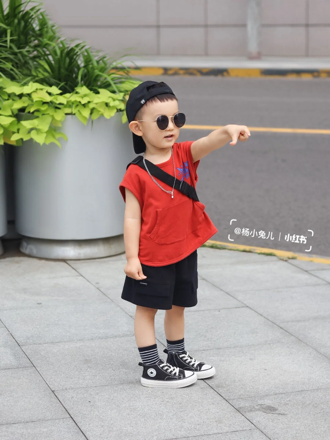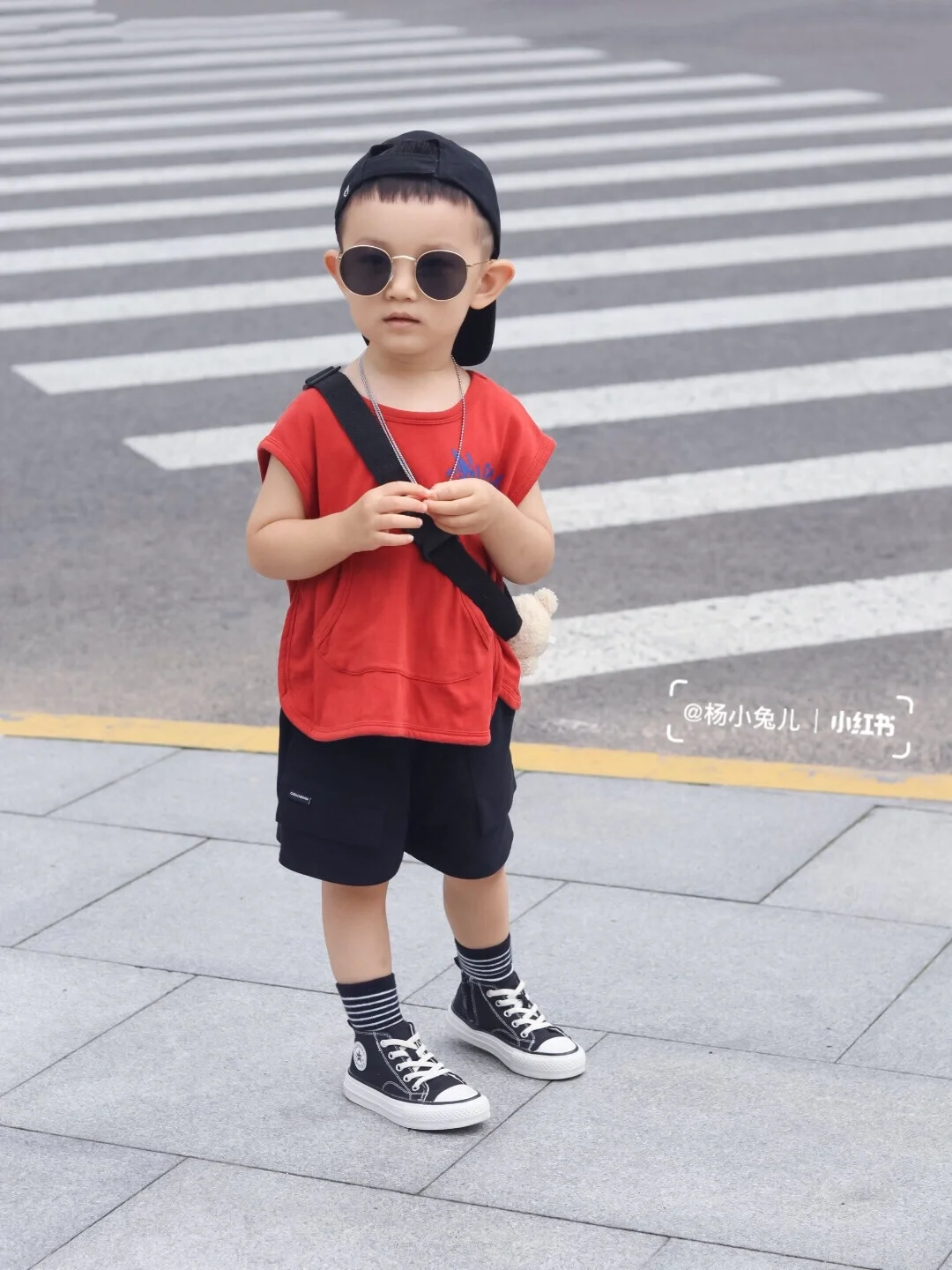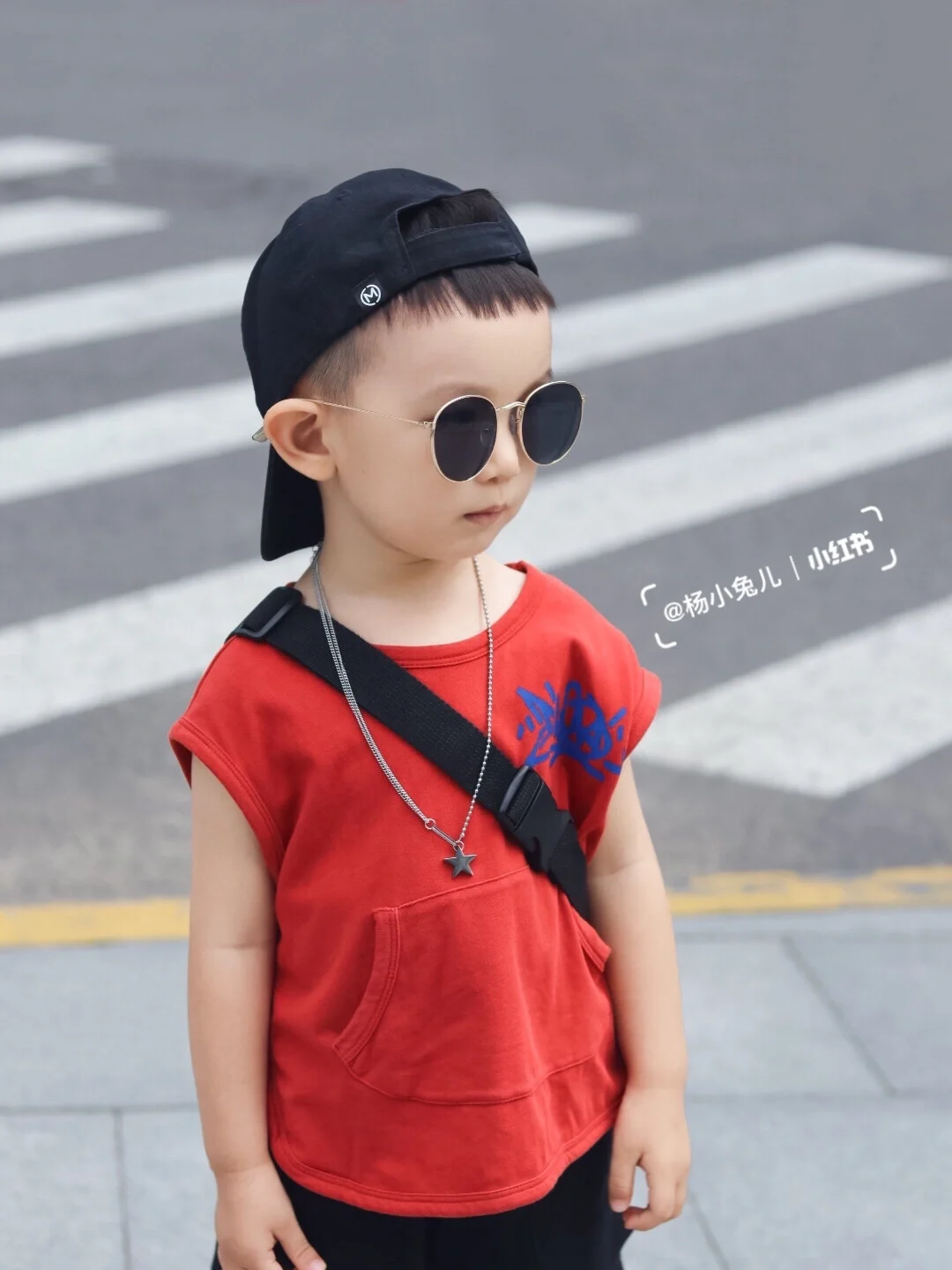 红黑配❤️🖤永远是经典~ 暗红色的无袖背心港味儿十足~ 墨镜🕶项链搭配起来~ 这个酷盖也太哇塞了吧❗️ —————— 男童穿搭|男宝穿搭|男娃穿搭|宝宝穿搭|不费力穿搭|夏日穿搭|萌娃日常|幼儿园穿搭|穿搭分享|每日穿搭|潮童穿搭