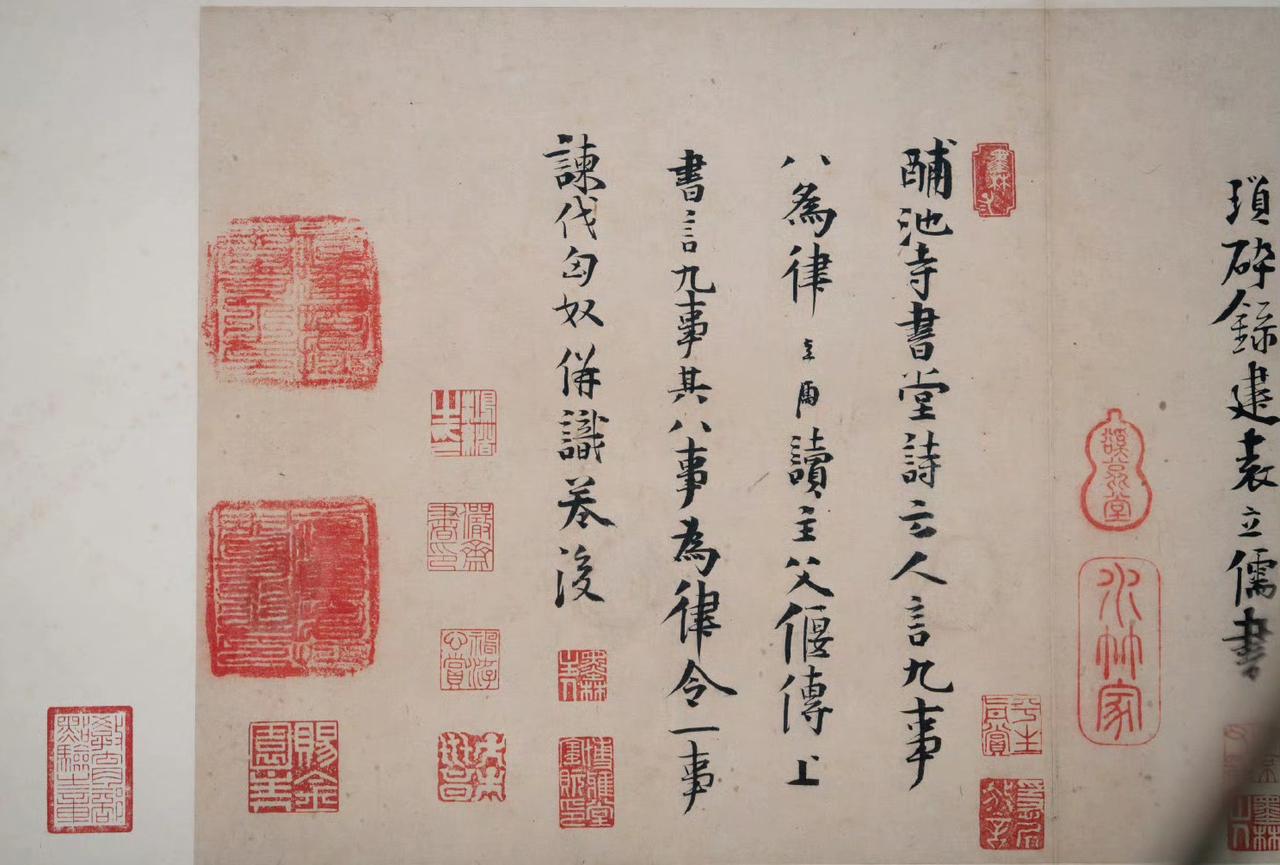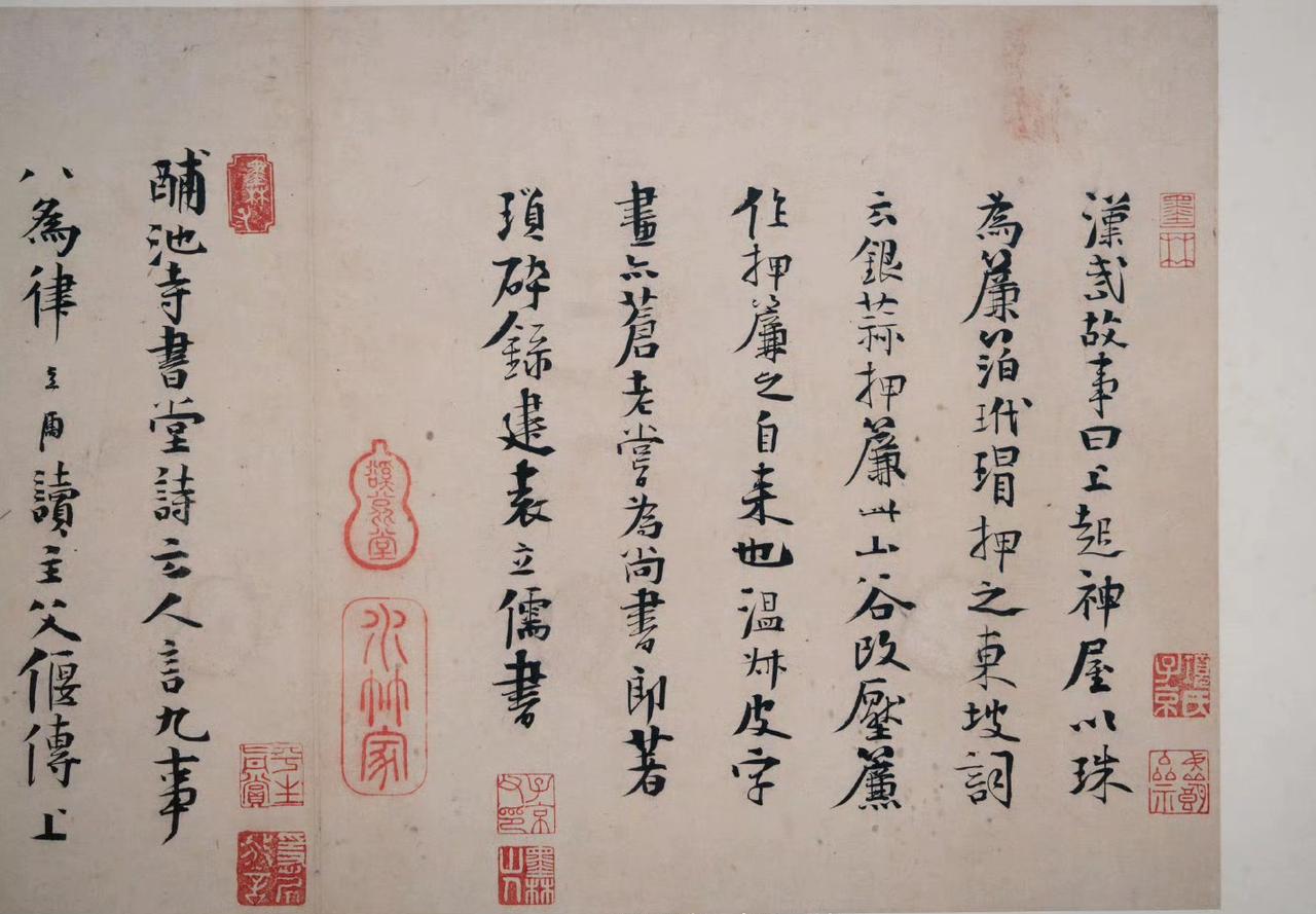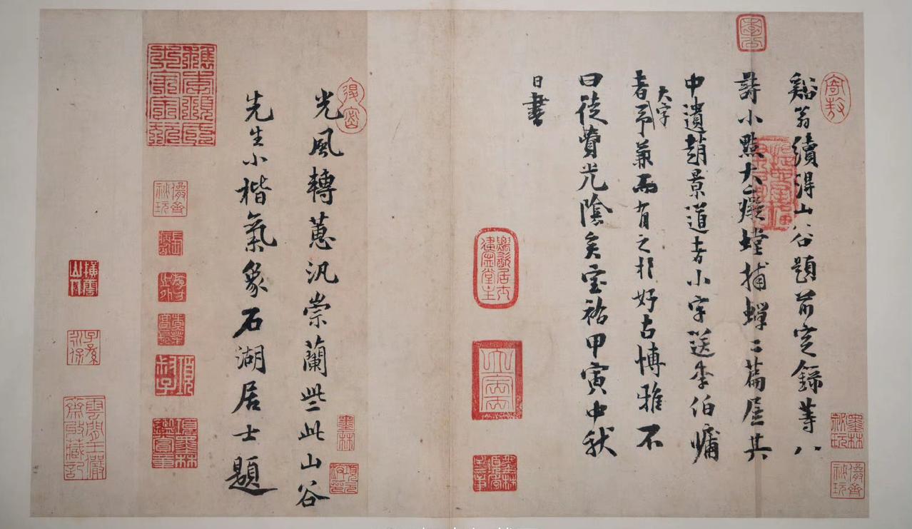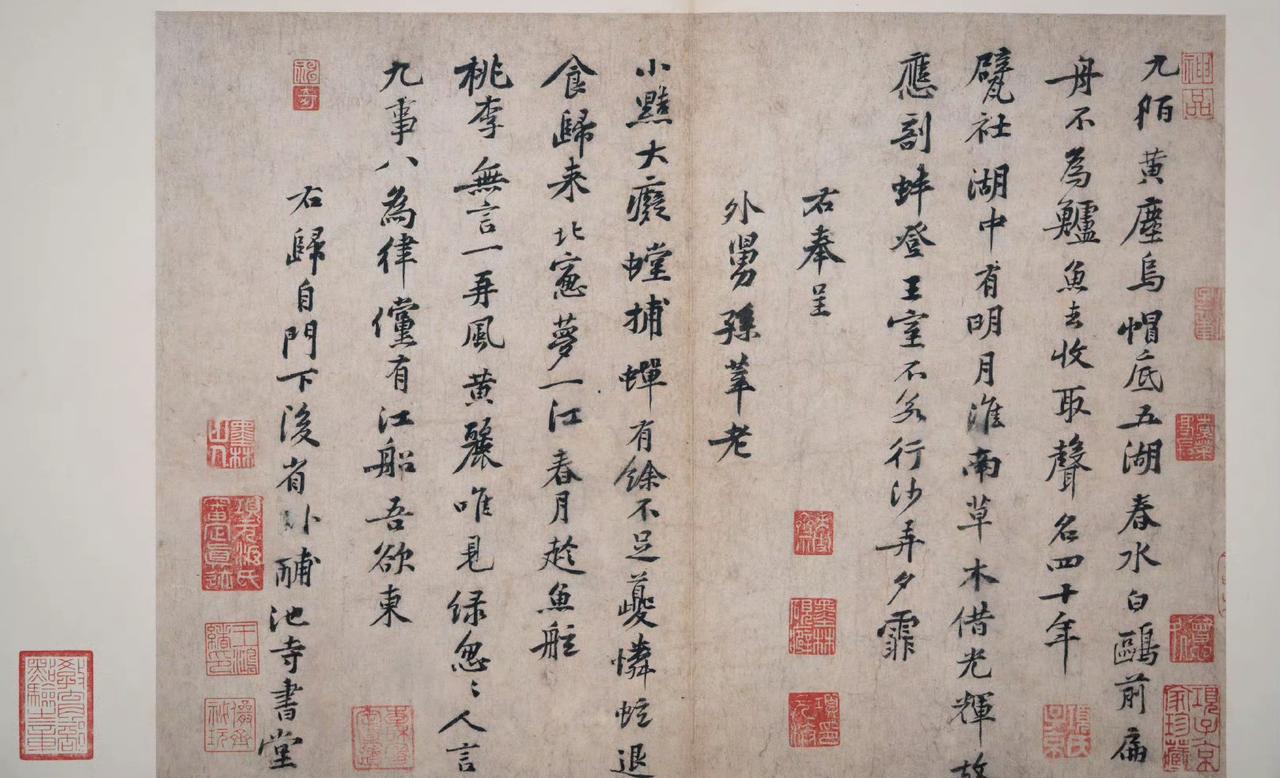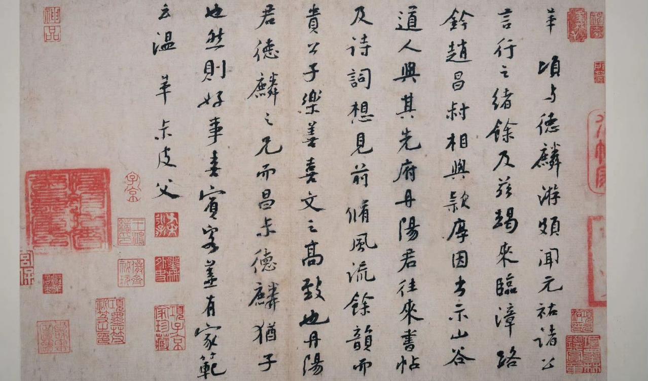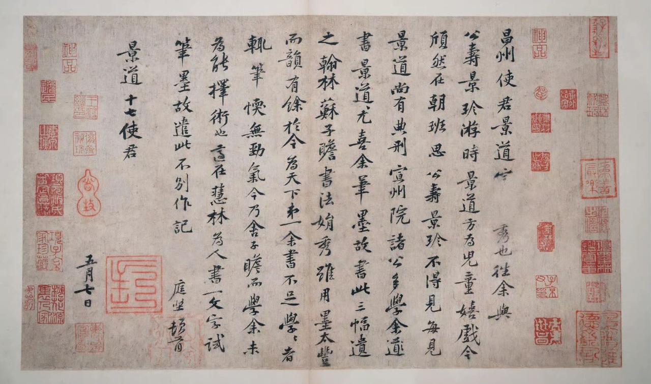 宋 黃庭堅 致景道十七使君尺續並和王仲至少監詠姚花詩四首 紙本 冊頁 此信寫給宗室趙景道(生卒不詳),根據內容推定書於元祐四年(1089),四十五歲時。賞花吟月的愜意詩文,平和優雅的書風,似乎都展現出仕途生涯的風光,及與好友相聚汴京的歡樂時光。單字中刻意拉長的點畫和偏向瘦硬的勁挺用筆,已開始顯露出個人情性。