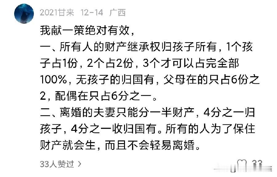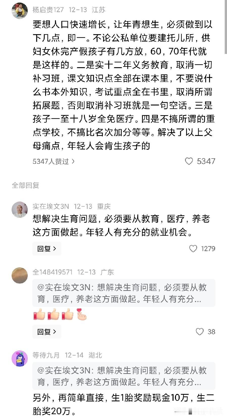 现在国家在鼓励生育,中央也定调了生育,教育政策。 聪明的大网友们纷纷评论留言,有说生多胎奖励现金的,有说减免购置税的,也有说落实双休政策,让年轻人有精力去生。 网友们奇思妙想,真的很棒。但综上所述,发现年轻人为什么不愿意生了,主要有以下几点原因?彩礼高,收入低,经济压力过于大。 长时间工作,精力的确不充沛。教育、医疗这些综合成本太大,生育成本大。
