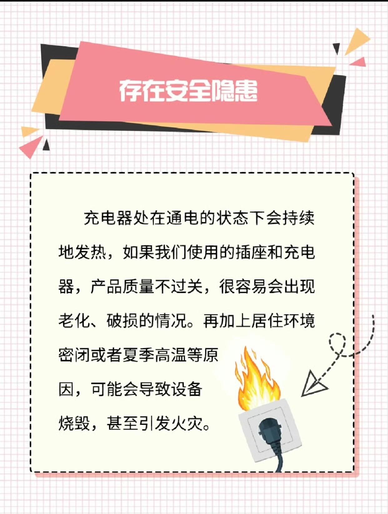 手机充电器一直插着不拔,真的太危险了!很多人为了充电方便,就把充电器长期插在插座上,觉得没啥问题。但实际上,充电器即便没连手机,接通插座后也在工作,会耗电不说,还会持续发热。 长期这样,会加速器材和材料老化,容易产生短路或高压击穿,引发火灾。之前就有天津一女子睡前放床头充电,手机凌晨爆炸;辽宁一女孩充电玩手机被电击内脏受损。所以,手机充完电,一定要记得拔掉充电器,别为了图方便给自己埋下安全隐患。