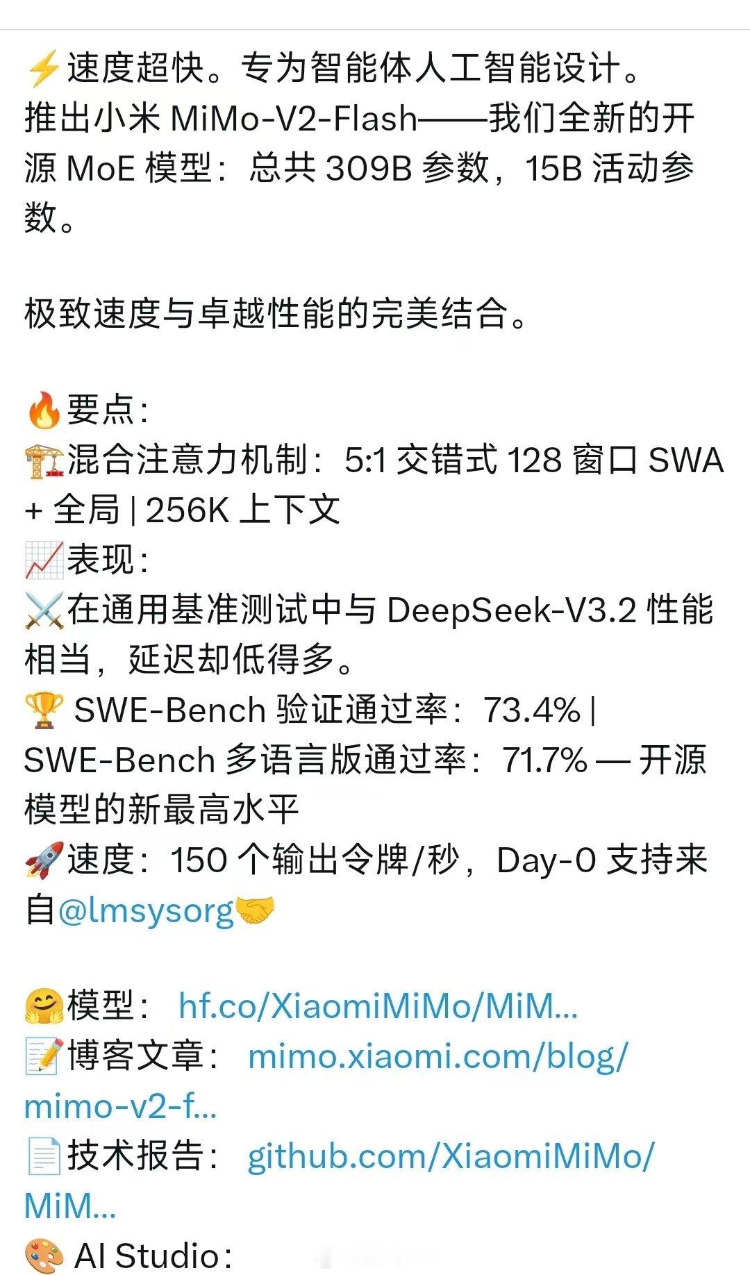 昨天晚上小米MiMo-V2-Flash发布了,小米大模型以MiMo系列7B参数模型为核心代表,在2025年的权威测评中,已跻身开源小参数模型第一梯队,数学/代码/多模态能力突出,端侧部署与推理效率优势明显,整体处于国内第一梯队、全球小参数模型领先水平。试了一下,响应速度非常之快。