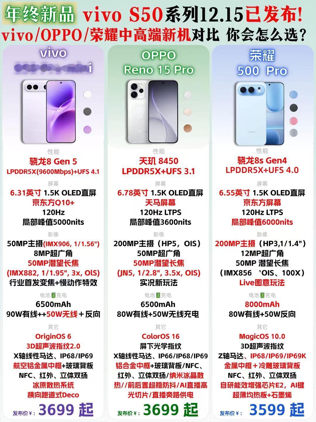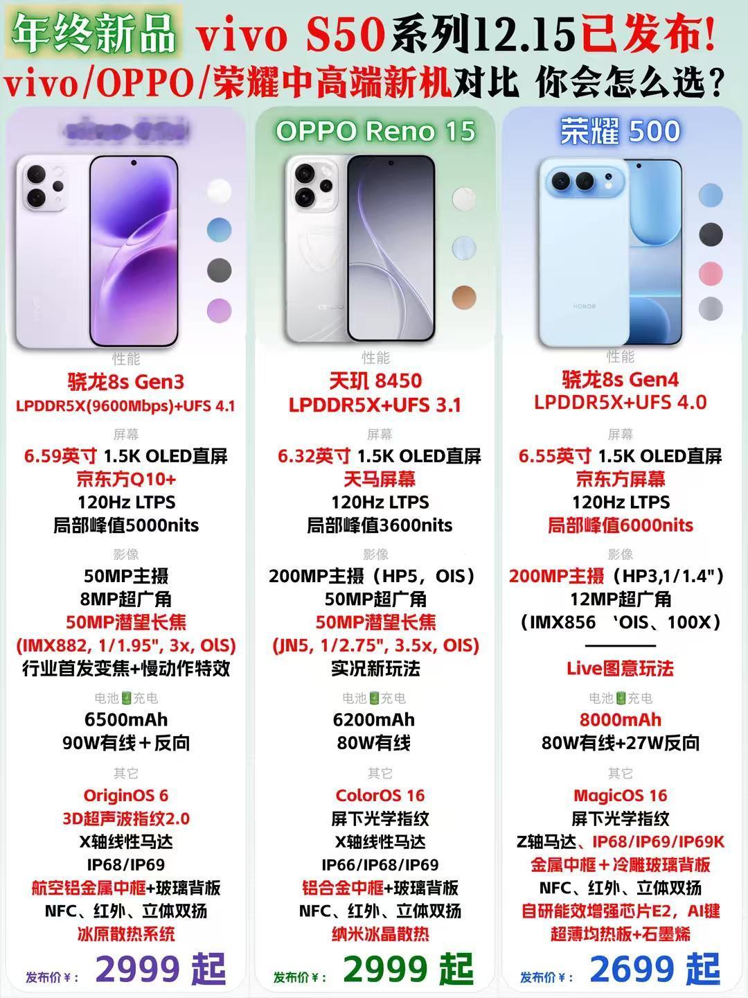 看了vivoS50和vivoS50 Pro mini的定价,坦白说有点超预期,但好像又情有可原,就挺纠结的! vivo S50: 12+256G 2999¥ 12+512G 3299¥ 16+256G 3399¥ 16+512G 3599¥ vivo S50 Pro mini: 12+256G 3699¥ 12+512G 3999¥ 16+512G 4299¥ vivoS50比起S30涨价了300元,把处理器从骁龙7Gen4提升到骁龙8sGen3,潜望长焦有一部分升级还有IP68/IP69防水、3D超声波指纹,再考虑到最近内存涨价,多因素一结合,好像涨价事出有因,但是跟隔壁荣耀500一对比,整整贵了300元,价格还是虚高。 至于vivo S50Promini,比起上一代就涨价了100元,但是处理器换成了骁龙8Gen5(之前都是天玑次旗舰芯片),这相当于是骁龙8 Elite Gen 5的青春版,这次还上了3D超声波指纹解锁和无线闪充,拍照水平也跟X300很接近了(至少也是X200的水平)。所以这次vivo S50Pro mini涨价100元貌似也能接受(对比上一代S30Promini)。 但是跟之前发布的荣耀500、荣耀500Pro进行对比后,我们发现隔壁荣耀500系列确实价格更便宜,电池和芯片也小优,所以看起来就很割裂。不过话又说回来,vivoS50系列整体配置比起隔壁OPPO Reno 15系列又更实在一点,考虑到这几款手机都是线下机(还要华为的Nova系列),各家的打法和卖点不一样,所以不能单纯从配置去分析。 接下来就是看“疗效”吧,就像去年的vivoX200Promini一样,因为定价和定位很尴尬,今年直接把X300搞成小屏旗舰了。S50系列如果销量不错,那证明内部定位和打法是没问题,但要是销量不理想,那么下一代S60系列一定会进行调整。