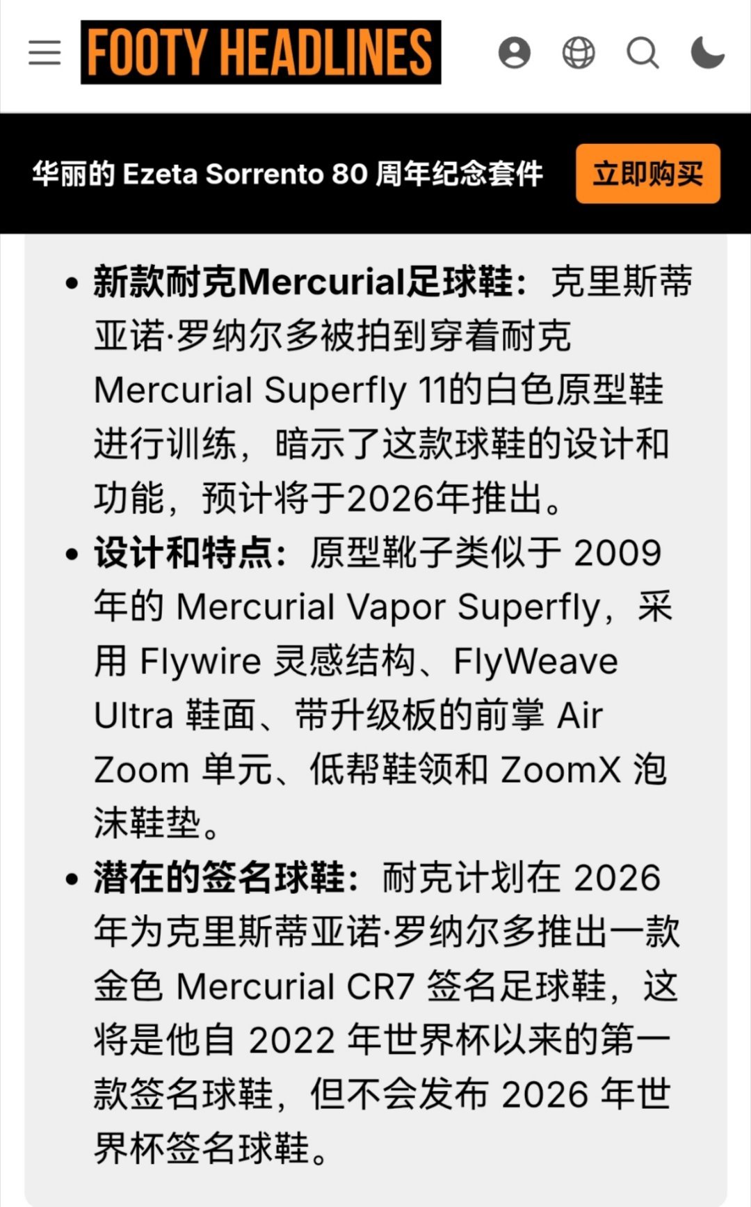 C罗 据足球装备网站Footy Headlines耐克计划在 2026年为克里斯蒂亚诺·罗纳尔多推出一款金色 Mercurial CR7 签名足球鞋,这将是他自2022 年世界杯以来的第一款签名球鞋,但不会发布 2026 年世界杯签名球鞋。