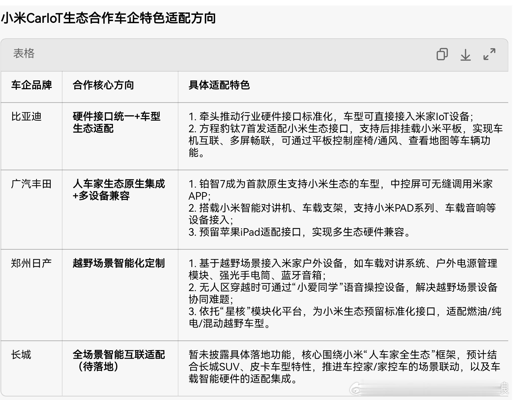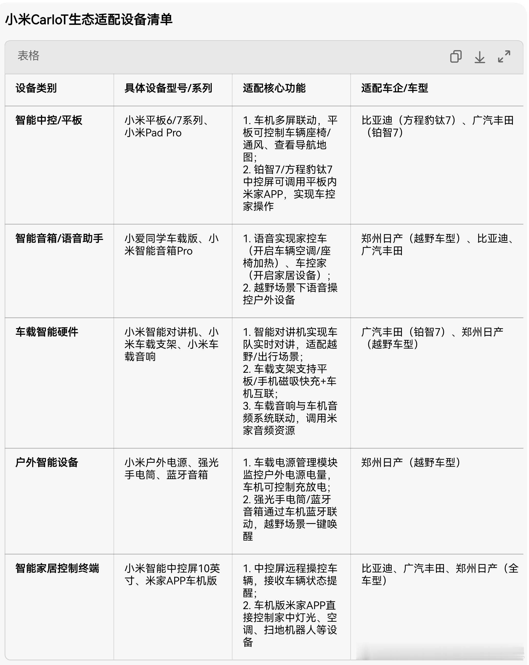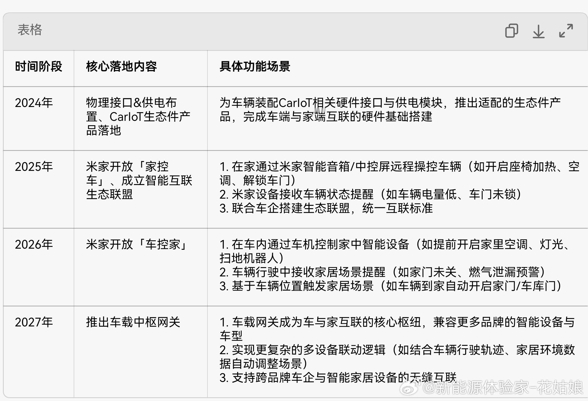 作为同时唯一和小米、华为、美的等在手机或平板或汽车合作的新能源汽车行业龙头比亚迪,在人车家生态上牵头硬件接口统一再合适不过了,车型生态适配。小米的人车家全生态也是其核心战略,旨在打通人、汽车、家居设备的智能互联,实现多场景的无缝协同,核心围绕CarIoT生态展开,具体布局和进展如下:1. 核心合作阵营首批合作伙伴包括比亚迪、广汽丰田、长城、郑州日产等车企,共同打造开放的智能互联生态。2. CarIoT生态开放时间节奏2024年:布置物理接口&供电,落地CarIoT生态件产品;2025年:米家开放「家控车」功能,成立智能互联生态联盟;2026年:米家开放「车控家」功能,实现车辆对家居设备的反向控制;2027年:推出车载中枢网关,进一步深化车与家的互联架构。3. 核心功能体验支持在家通过米家设备远程操控车机(如远程开启座椅加热),也能实现车与家的场景联动(如车机接收家门铃对讲画面)。比亚迪比亚迪汽车新能源汽车大v聊车新能源大牛说