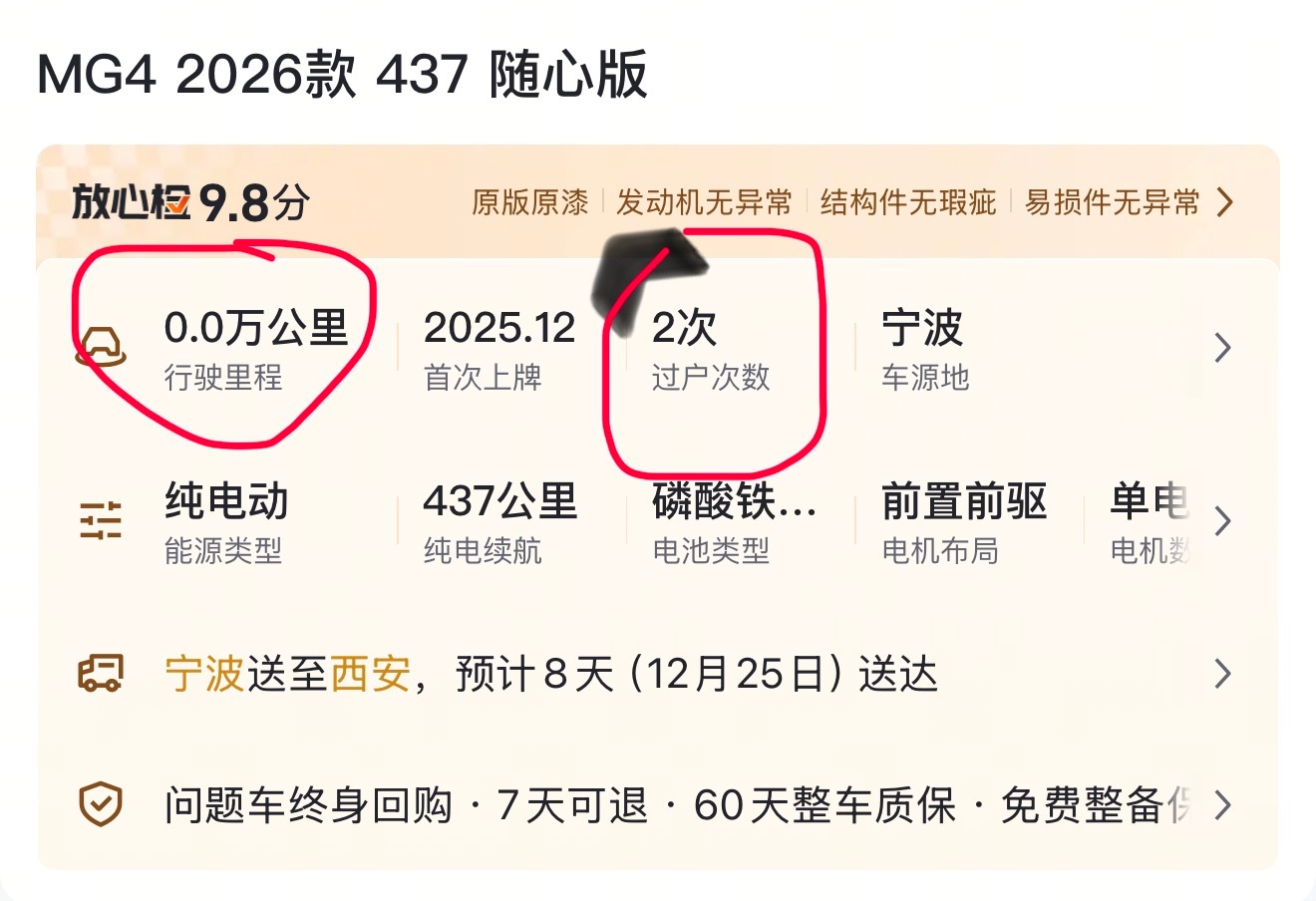 零公里的名爵MG4 2026款 437 随心版一口价5.99万相比新车便宜了快一万有意思的是,零公里车却过户了两次这是什么操作?◔‸◔?