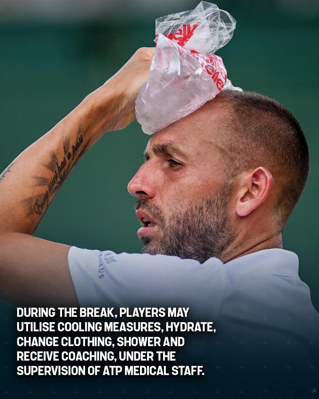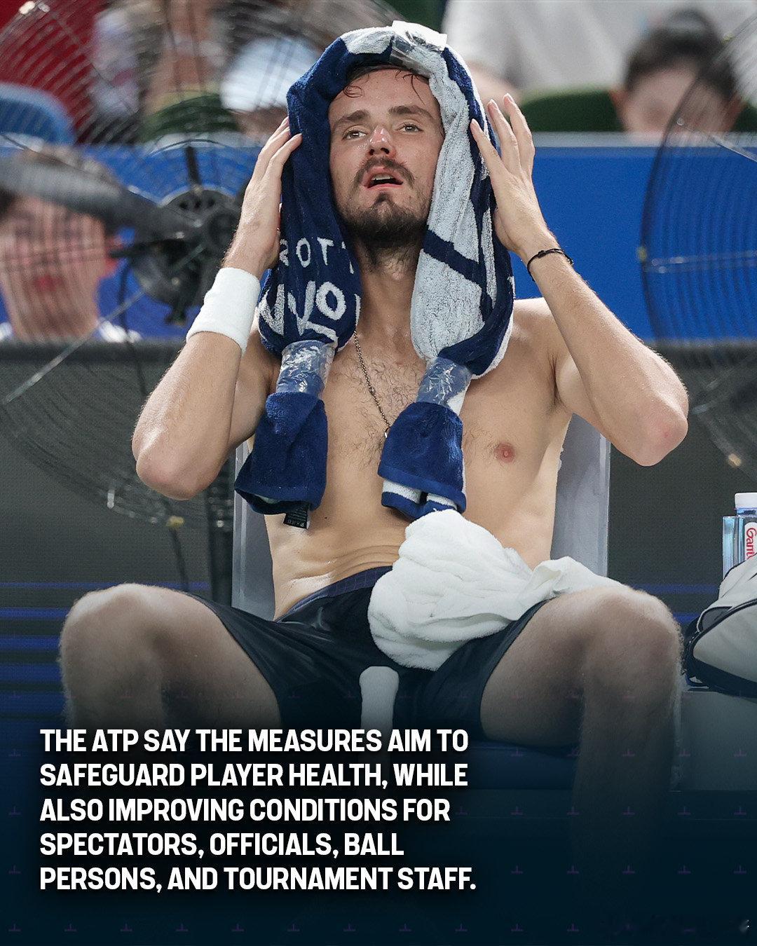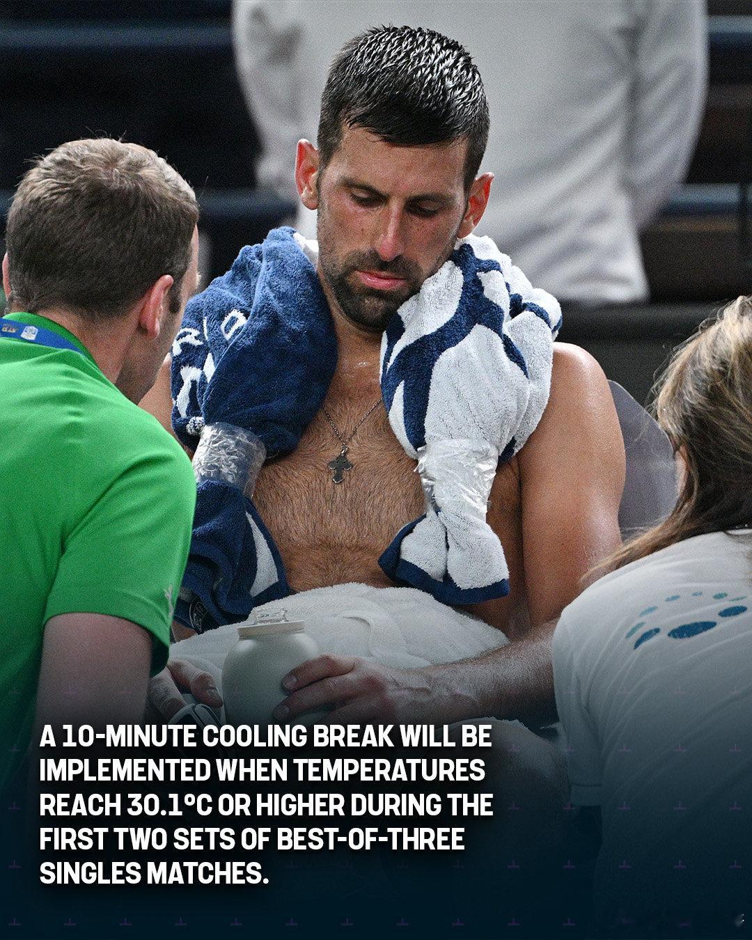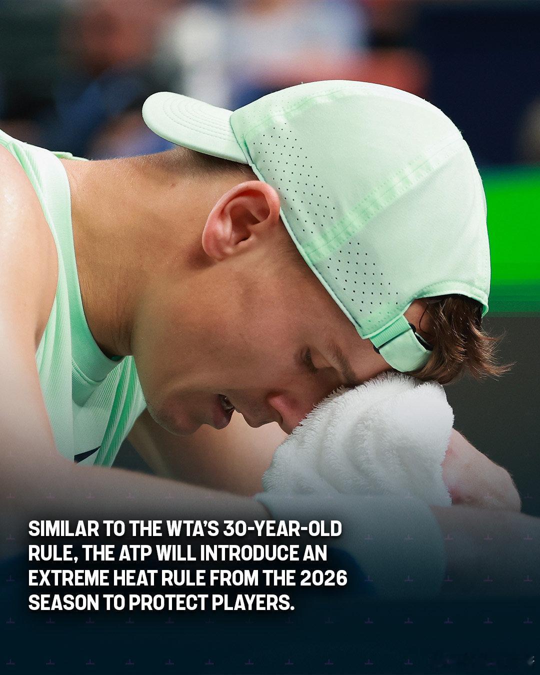 ATP将在2026赛季实施极端高温新规,来保障运动员的健康·三局两胜的单打比赛中,如果温度达到30.1度或更高,前两局将安排10分钟的补水时间·补水期间运动员们可以补水降温、更换球衣、冲凉及接受教练指导·如果气温超过32.2度,比赛将暂停