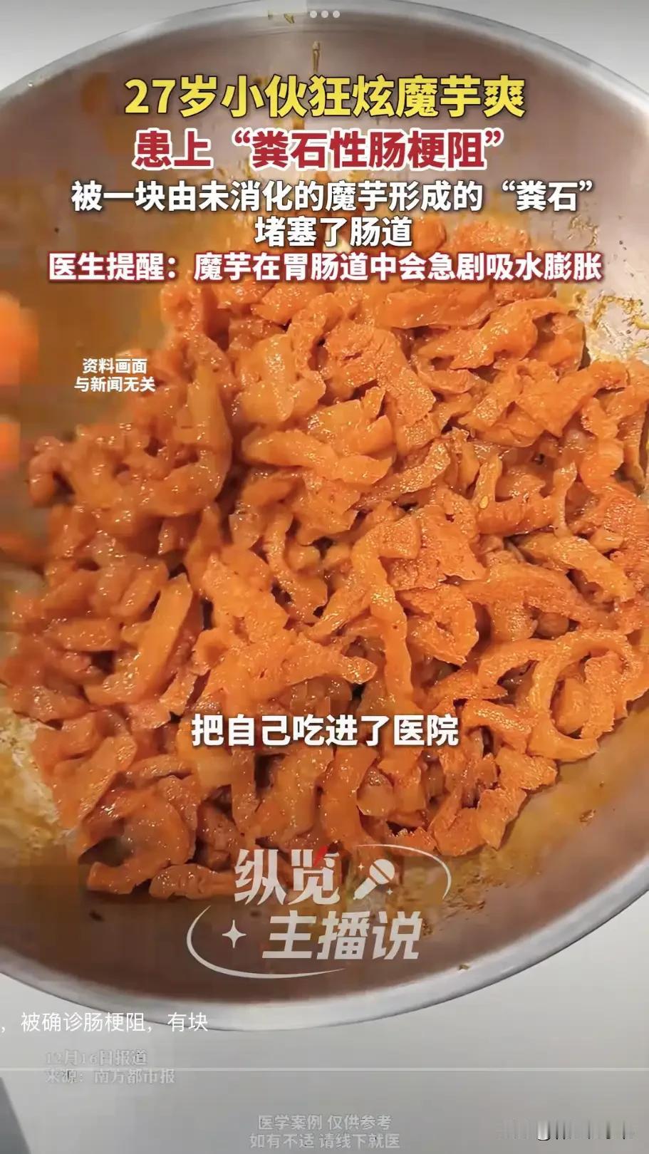 有个27岁的小伙小禹,同事带来一盒麻辣魔芋爽,他尝着好吃就吃了不少。加班肚子饿,又把剩下一大盒吃了。结果深夜腹痛,起初以为胃病,吃了药也不管用,最后去医院检查是肠梗阻,肠道里有“粪石”。 魔芋主要成分是葡甘露聚糖,遇水会大量膨胀,吃太快或咀嚼不充分,就可能堵肠道。而且很多魔芋制品加了大量盐、糖、油和添加剂。魔芋虽好,可别贪多呀!