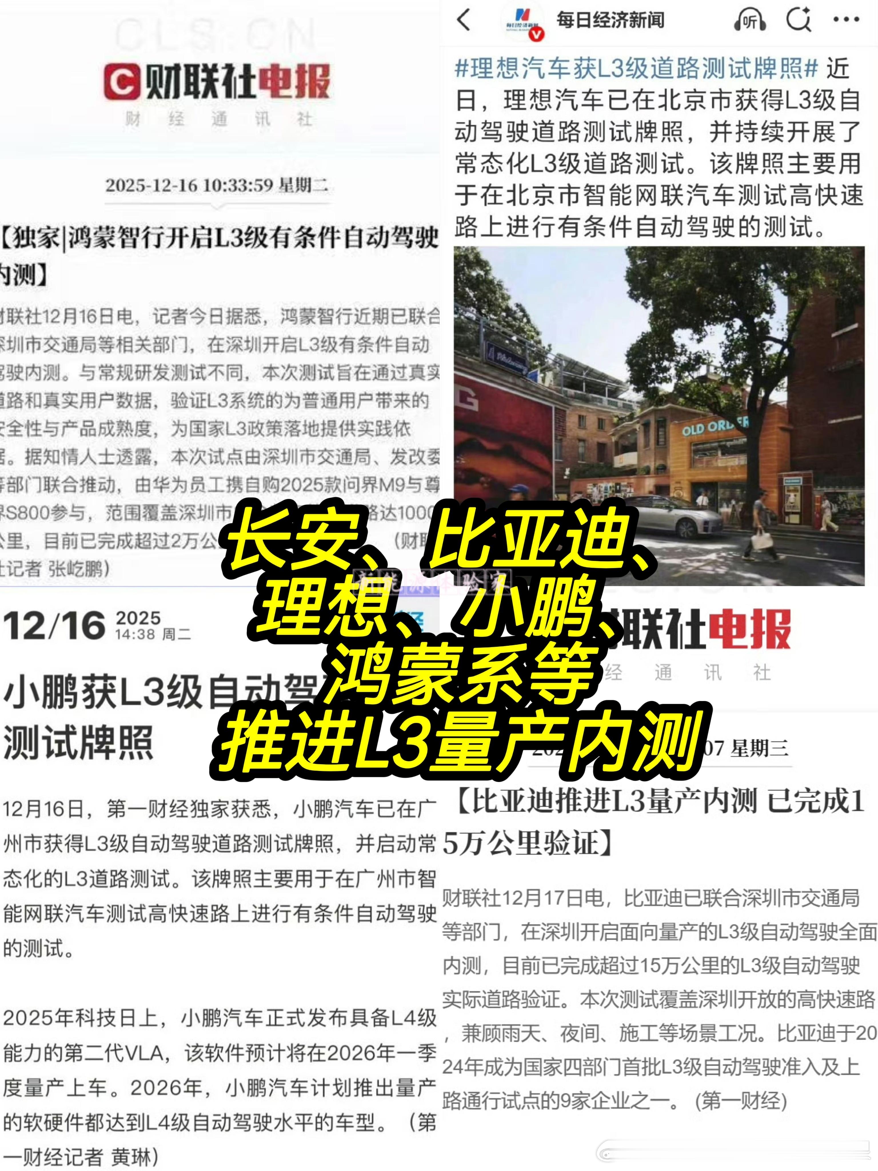 首批L3级自动驾驶准入及上路通行试点的9家企业北汽、长安、比亚迪、理想、小鹏、鸿蒙系等推进L3量产内测。比亚迪新能源汽车大v聊车新能源大牛说智能驾驶小鹏汽车理想汽车