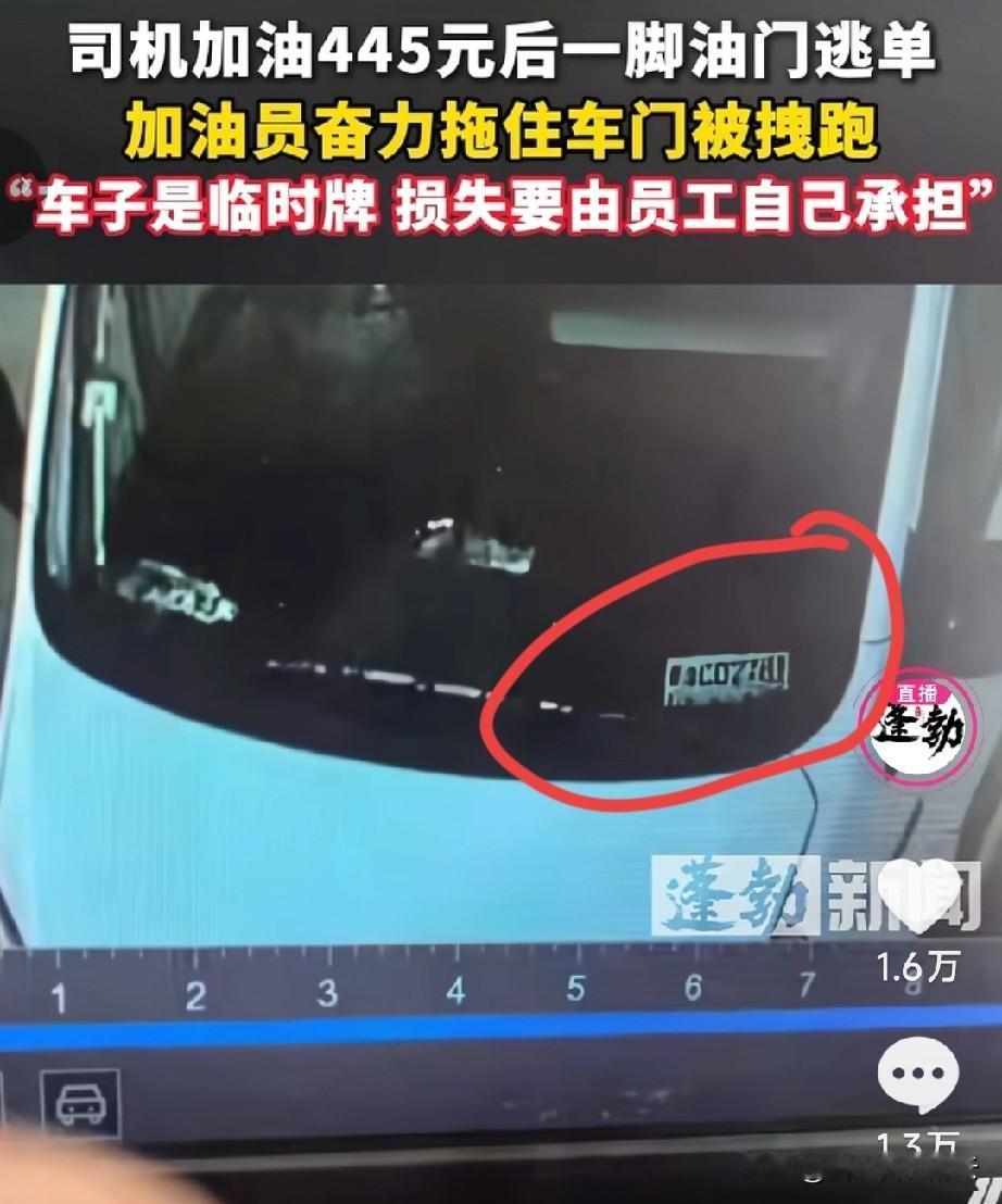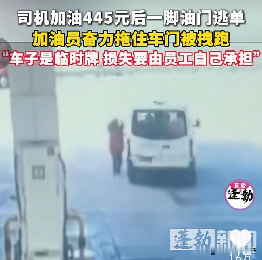 真丢人!山东泰安一加油站内,女加油员刚给一辆白色汽车加完油,车主立马锁车,然后加油门开车逃单。 加油员反应其实挺及时,发现他要跑时,赶紧拽住车门跟着车跑,可是人怎么跑的过车,加油员在跟跑了几十米后还是被甩开了。 这个车主一看就是故意的,他加了445元的油,也不是个小数目,都赶上加油员两三天的工资了。加油员说,遇到顾客逃单他们就要自己承担油钱。 她看到车主逃单后就立马报警了,希望能找到车主挽回损失。可是警方说那辆车是临时牌照,监控里拍不清楚,无法看清车牌号,所以查不到车主的信息。 有网友说,拍违章的时候拍的那么清,怎么一到这种事就看不清了。应该申请交警调道一路上的监控,不信查不到他。 我觉得这件事虽然不大,但是影响还是很恶劣的,警方应该重视。因为加油站的工作人员一般都是生活不太富裕的人,这一单可能是她几天的工资,如果逮不到人,以后效仿者会不会越来越多? 对于这件事,你怎么看呢?
