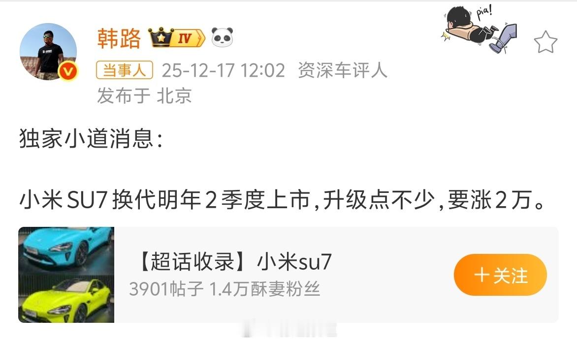 小米新一代SU7明年二季度上市 上市两年才换代,在这个普遍一年一改甚至一年磨三剑的快节奏时代,简直就是一股清流SU7 Max放到今天依然是同级非常水桶的一款车,400V平台的标准版和Pro版倒确实需要升级了。大家有啥期待?