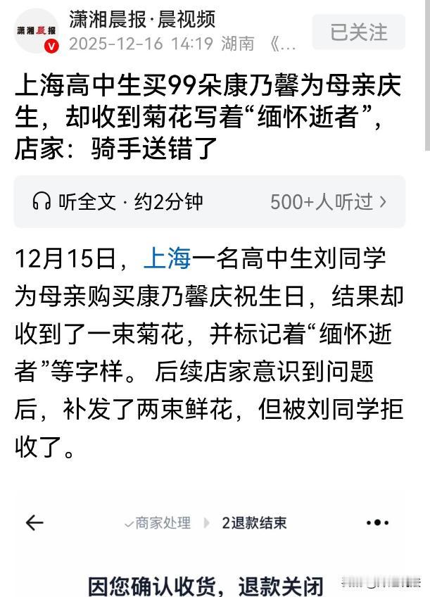上海,一男生刘同学攒零花钱给母亲过生日,订了99朵粉色康乃馨,还备注了生日祝福,可生日宴会上,花店竟送来黄白相间、黑纸包裹、飘带写“深深怀念”的菊花,场面十分晦气,生日宴不欢而散,店家补发鲜花被拒,还拒绝退款,刘同学发遭遇到网上,店家触犯行业大忌,还打电话骂人、公布其个人信息,事情越闹越大。 (来源:潇湘晨报·星视频) 刘同学,一直盼着给母亲过个难忘生日,他省吃俭用,攒了好久的零花钱,就为了给母亲一个惊喜。 他精心挑选,订了99朵粉色康乃馨,还在订单上备注了温馨的生日祝福,想着母亲收到花时开心的样子,刘同学满心期待。 生日那天,家人都聚齐了,就等着花送来,一起庆祝,可左等右等,花终于送到了,打开一看,所有人都愣住了。 送来的哪是什么粉色康乃馨,而是黄白相间的菊花,用黑纸包得严严实实,飘带上还写着“深深怀念”,这场景,要多晦气有多晦气。 母亲的脸色瞬间就变了,原本开心的氛围一下子降到了冰点,好好的生日宴,就这么被这束花搅得不欢而散。 刘同学又气又急,他赶紧联系花店,质问他们为什么送错花,花店一开始还敷衍,说会补发鲜花。 可刘同学觉得,这错犯得太离谱,不是补发就能解决的,他拒绝了补发,还把自己的遭遇发到了网上,想让大家评评理。 没想到,这一下可捅了马蜂窝,花店的工作人员不仅打电话骂人,还把刘同学的个人信息公布到了网上。 这下,刘同学的生活可乱了套,他不断接到骚扰电话,个人信息被泄露,让他烦不胜烦。 这事越闹越大,网友们纷纷声讨花店,有人说,花店太不负责任,送错花还这么嚣张。 也有人觉得,刘同学有点太计较了,补发不就好了,何必闹到网上。 可更多人支持刘同学,觉得花店的行为太过分。 大家都在想,这花店到底怎么回事?怎么敢这么对待顾客?难道就不怕失去信誉,以后没人光顾吗? 还有人说,现在个人信息泄露太严重了,花店这么做,不仅侵犯了刘同学的权益,也触犯了法律。 花店送错花,这明显是违约行为。 根据《民法典》第五百七十七条规定,当事人一方不履行合同义务或者履行合同义务不符合约定的,应当承担继续履行、采取补救措施或者赔偿损失等违约责任。 刘同学订的是粉色康乃馨,花店却送来菊花,这完全不符合约定,花店得承担违约责任,补发鲜花或者赔偿损失。 《民法典》第一千零三十四条规定,自然人的个人信息受法律保护。个人信息是以电子或者其他方式记录的能够单独或者与其他信息结合识别特定自然人的各种信息,包括自然人的姓名、出生日期、身份证件号码、生物识别信息、住址、电话号码、电子邮箱、健康信息、行踪信息等。 花店把刘同学个人信息公布到网上,这侵犯了他的隐私权,得承担侵权责任。 花店工作人员打电话骂人,这可能涉及侮辱、诽谤。 根据《治安管理处罚法》第四十二条规定,公然侮辱他人或者捏造事实诽谤他人的,处五日以下拘留或者五百元以下罚款;情节较重的,处五日以上十日以下拘留,可以并处五百元以下罚款。 工作人员的行为,要是情节严重,还可能面临行政处罚呢。 面对网友的声讨,花店一开始还嘴硬,不肯退款。 可随着事情越闹越大,他们也扛不住了。 最后,花店不得不退了刘同学194.42元费用。虽然钱退了,可这事给刘同学和家人带来的伤害,却不是钱能弥补的。 想想看,原本好好的生日宴,就因为一束花,变得如此糟糕。 母亲的心情,家人的感受,都受到了极大的影响。 这花店,为了省点事,或者因为疏忽,就送错了花,送错花也就算了,还态度恶劣,泄露顾客信息。 他们难道就没想过,这样做会带来什么后果吗?难道就不怕顾客投诉,影响自己的生意吗? 以后订花或者其他服务,一定要选靠谱的商家,不然,遇到这种不靠谱的,真是闹心又伤身。 您对这件事有什么看法呢?您觉得花店应该承担怎样的责任?刘同学的做法您支持吗?