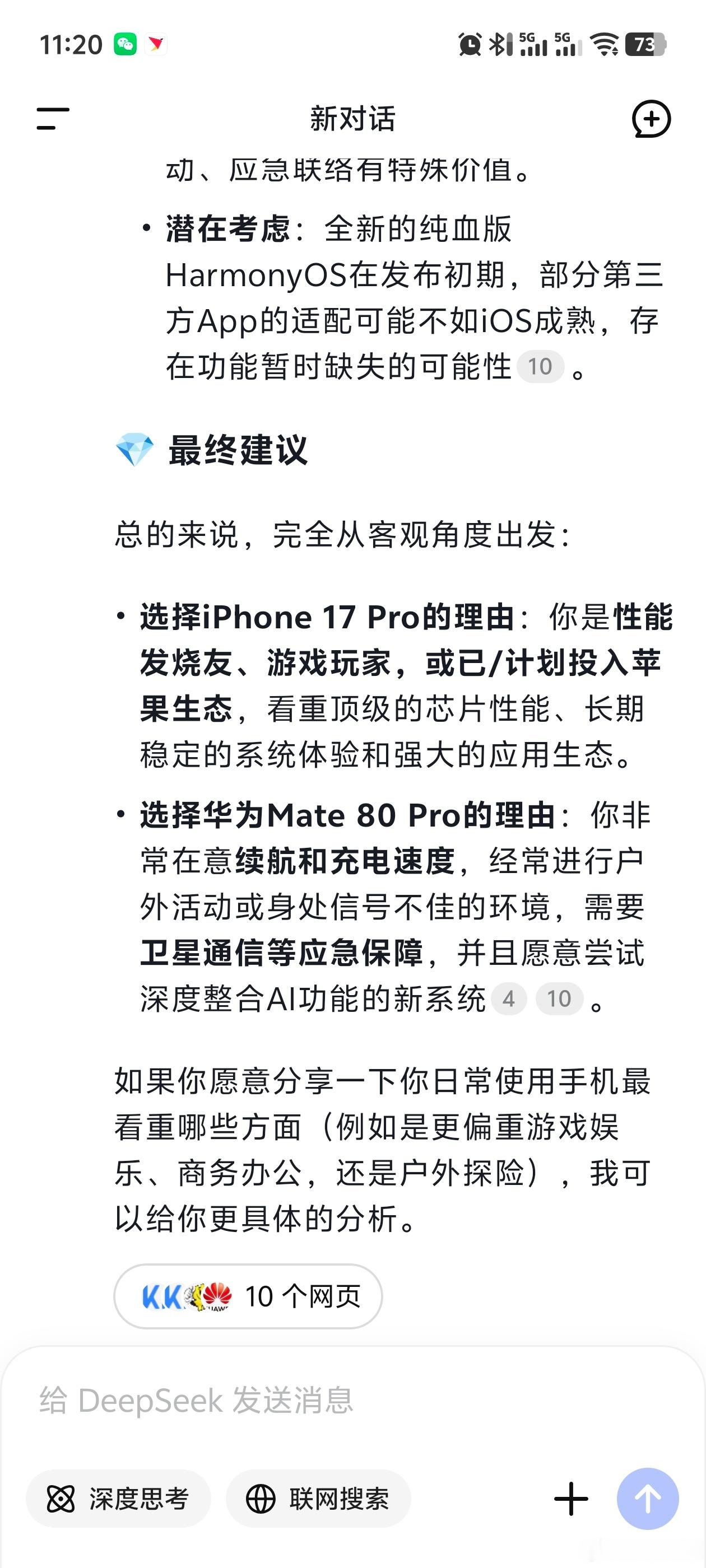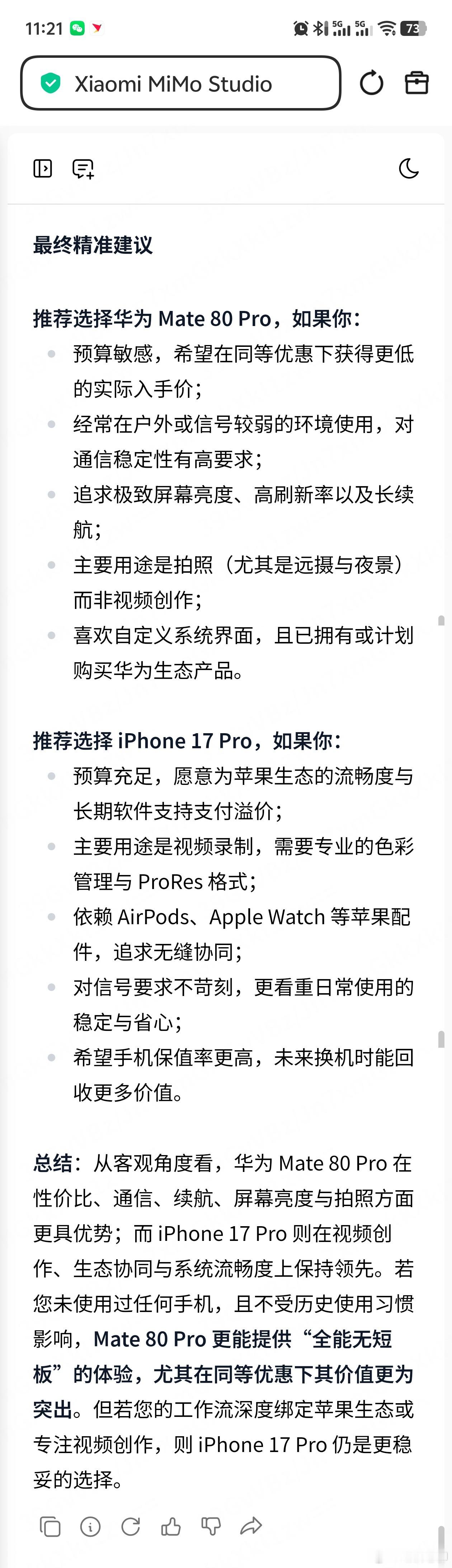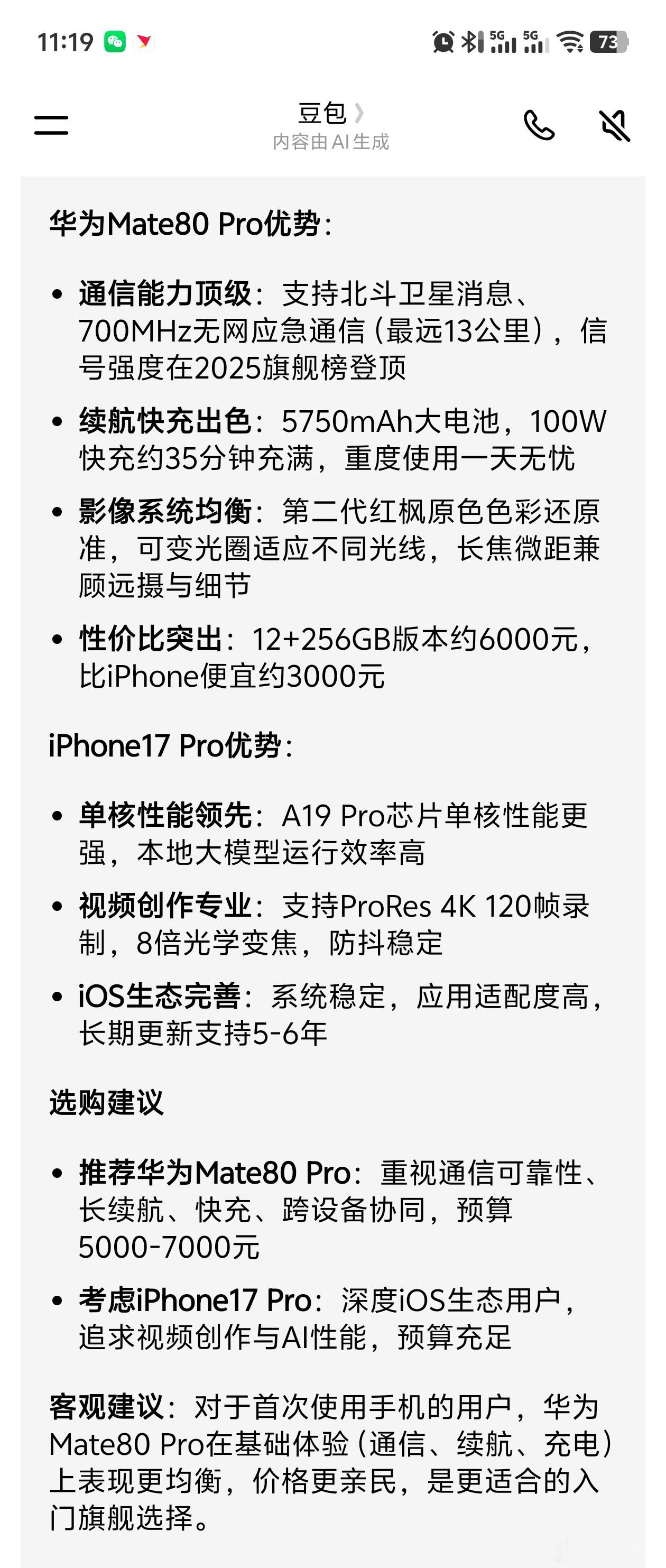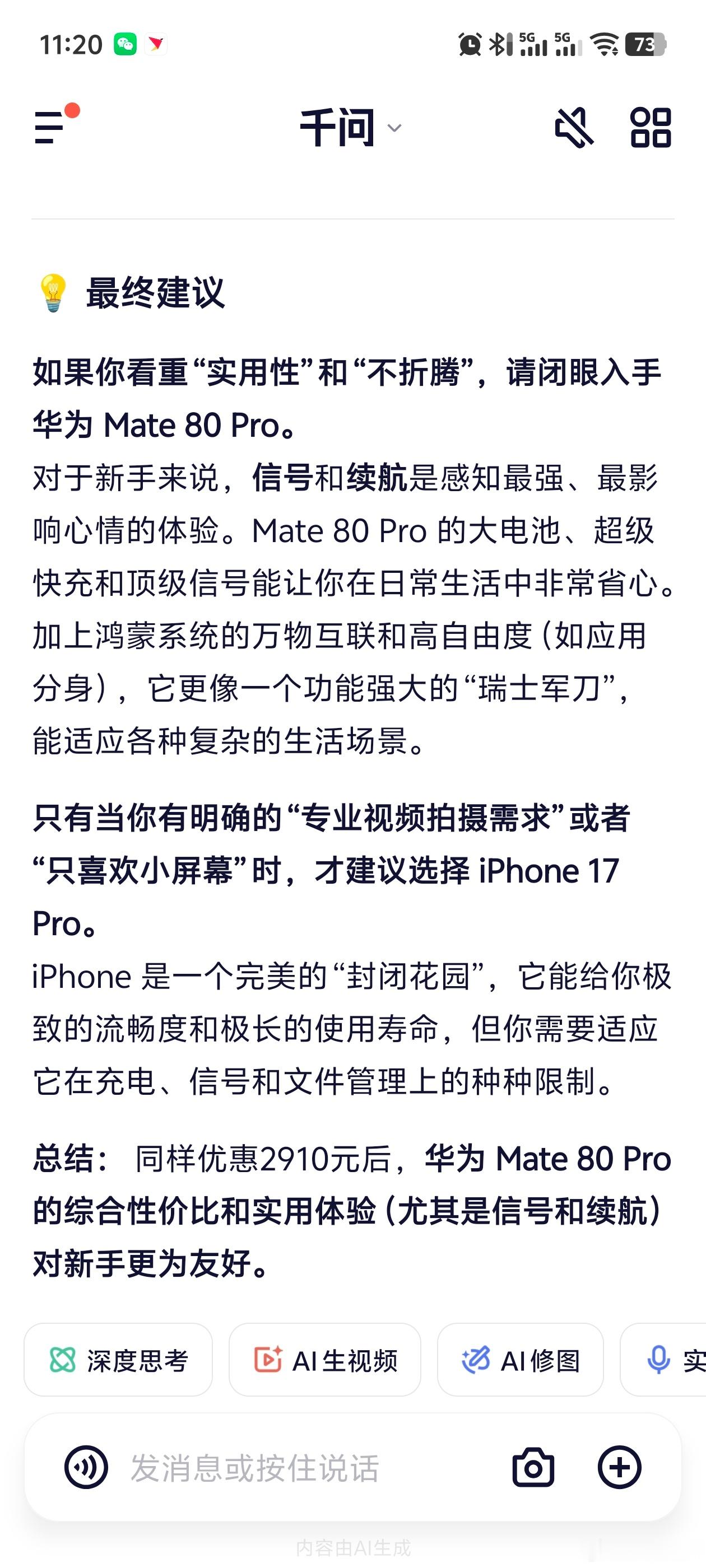 小米发布最新MiMo大模型 适用了一下小米的这个大模型,提了个问题“同样可以优惠2910元,我该选择入手iPhone17 Pro还是华为Mate80 Pro?不考虑我现在用的什么手机,当我从来没用过手机,请完全从客观角度给出精准的建议”,也发给了字节的豆包、阿里的千问、DeepSeek,看看下面他们各自的答复!图一图二小米和DeepSeek差不多,结论这也行那也行,等于没说,豆包和千问给出的结果还是有确定性的,符合预期。