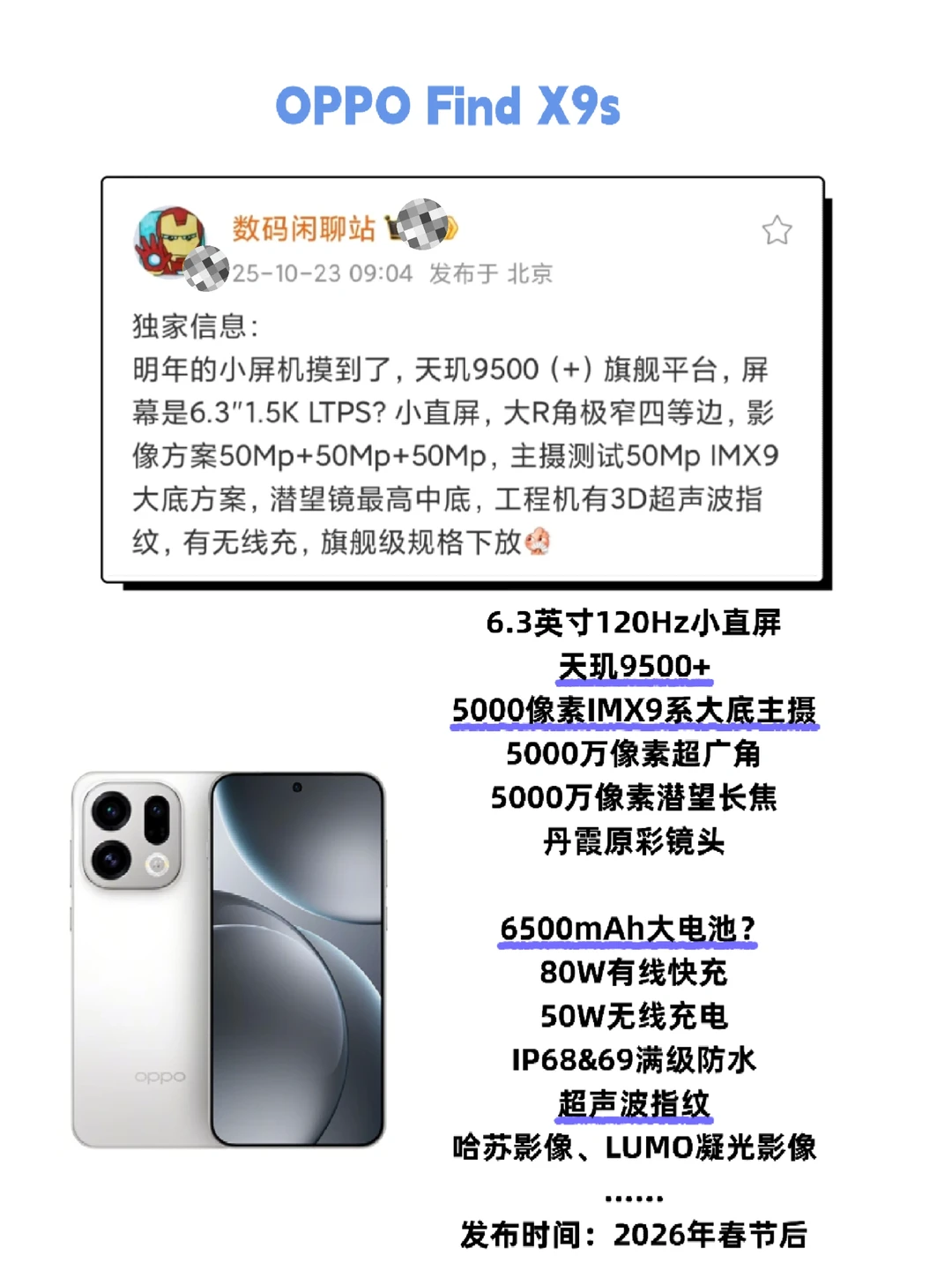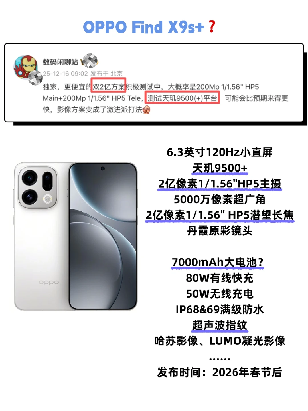 刚刚看到站哥发了个OPPO新机的消息,说OPPO正在测试双2亿像素方案,处理器是天玑9500(+),这可能就是OPPO Find X9s+吧,X9本来拍照就很强,现在一下子上双2亿,都快超越Pro了,得等了! 还有就是小屏Find X9s,会有新主摄、超声波、大电池等等,都是非常强的!预计春节后发布,你们期待吗?