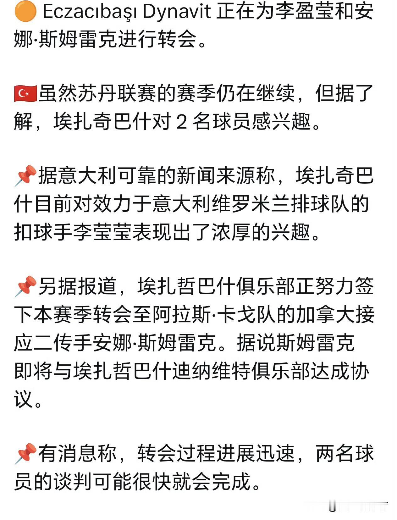 李盈莹要转会到土耳其伊萨奇巴希俱乐部吗?距离李盈莹去意大利米兰已经有17天了,至今还没有看到李盈莹签约米兰俱乐部的消息,也没有李盈莹通过体检的消息!网上又流传出土耳其豪门俱乐部伊萨奇巴希要跟着米兰抢李盈莹,说是要跟李盈莹签约这个赛季的后半段,感觉这是在跟意大利米兰俱乐部施加压力啊!米兰俱乐部到底什么情况,到底跟妹妹李盈莹签约成功了不,也不给个确切消息!
